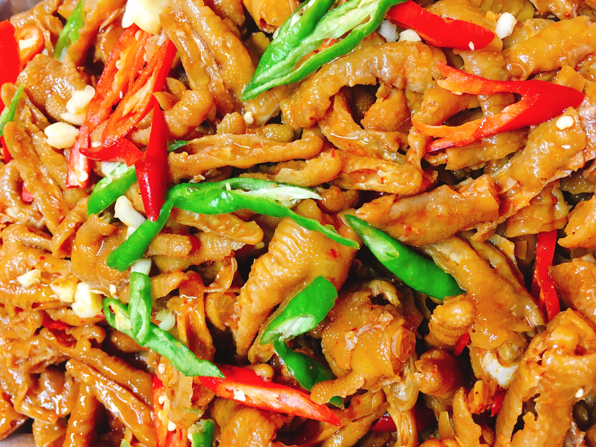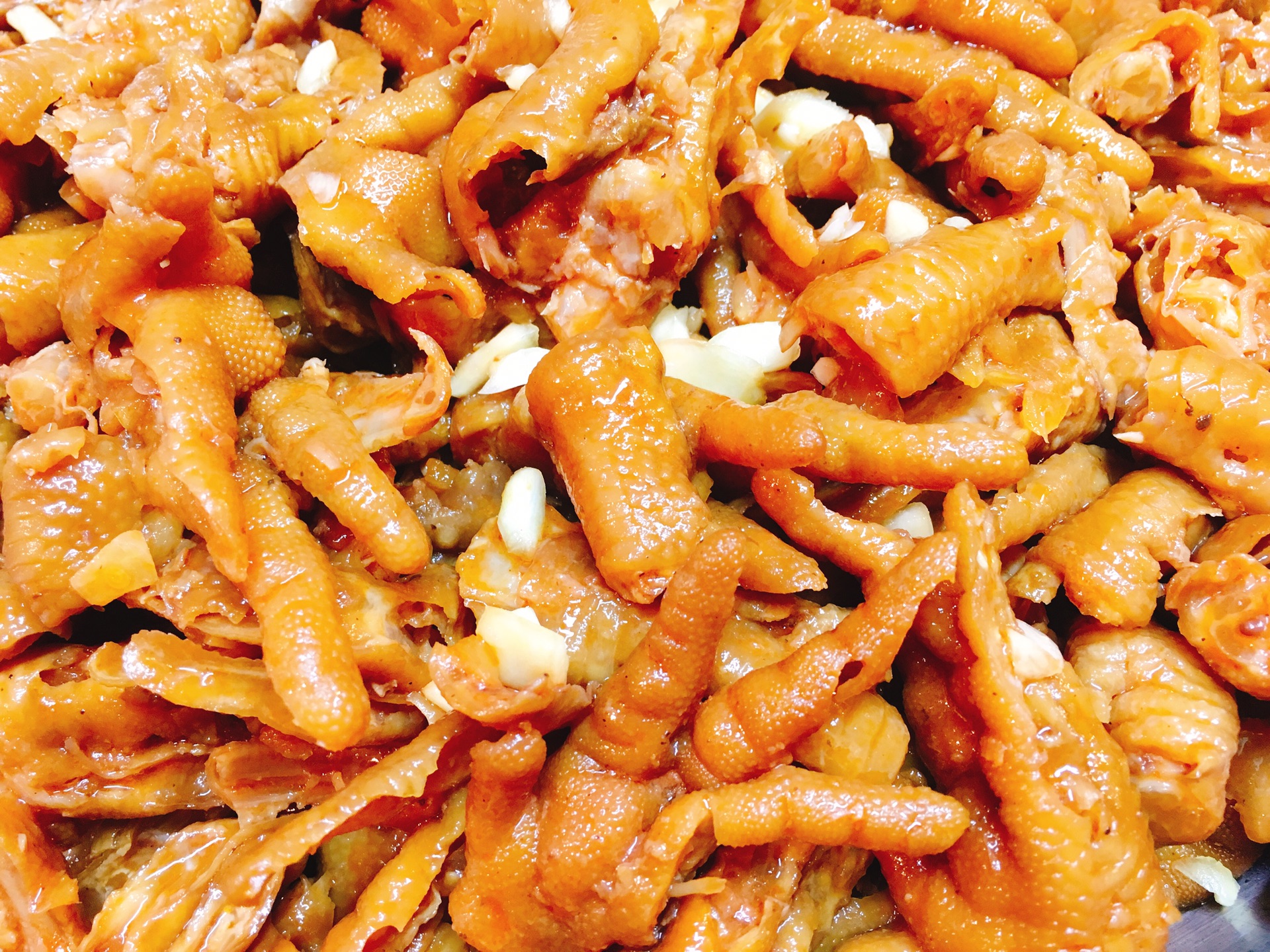 鸡爪冻,其实就是卤好的无骨鸡爪,有蒜香和香辣两种口味。鸡爪处理得很干净,一口一个,满满的胶原蛋白,香味四溢。
