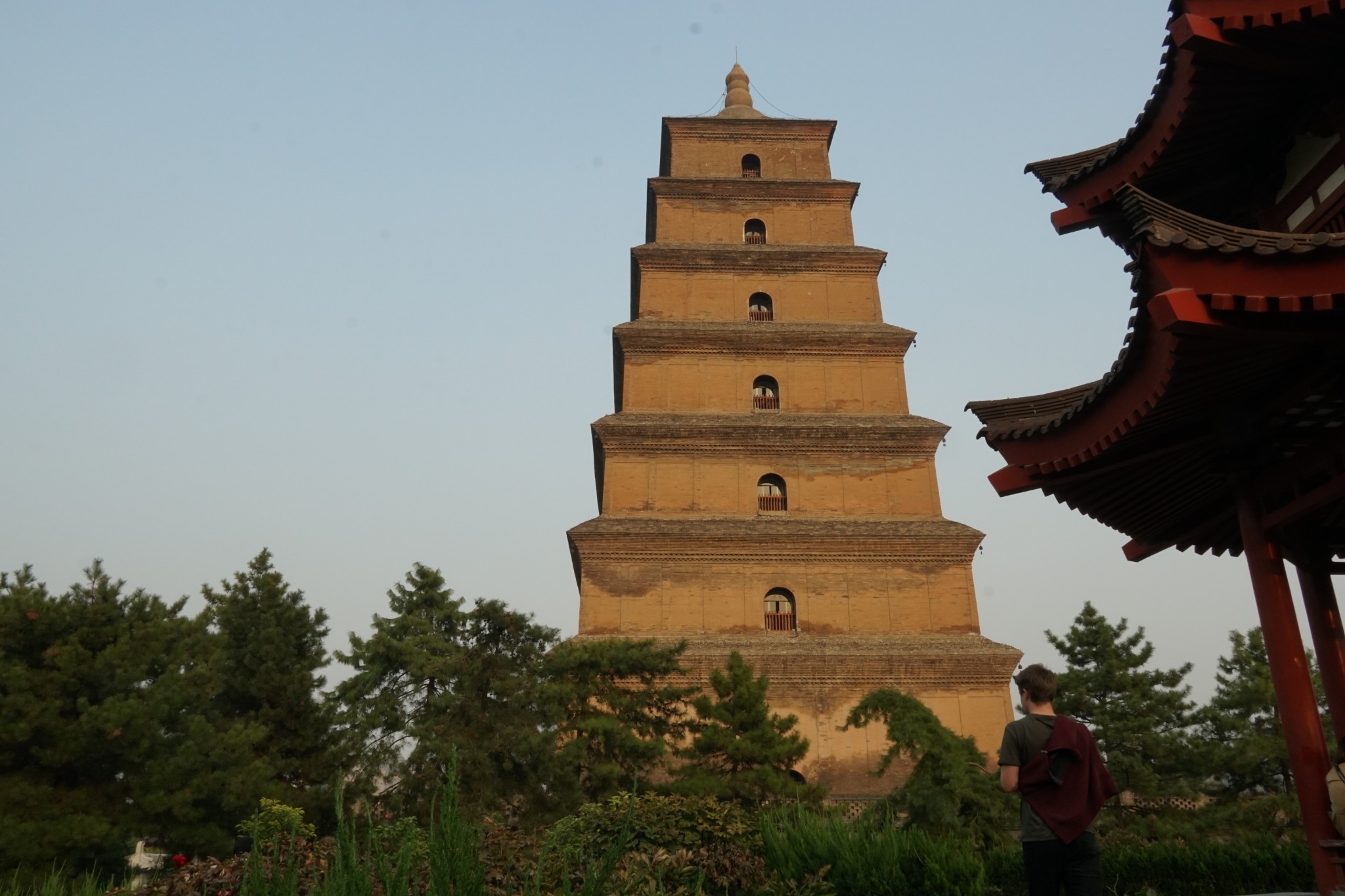 既然来了大雁塔,肯定是要登塔一游了。据说绕大雁塔一圈,可以保一生平安。塔一共七层,拾级而上,可以爬至最顶层,登高远眺。这座塔历经了几朝几代的修葺,早不是唐朝时候的样子了,塔里面也没有当年从西域取回的经文了。来这里,还是要听一听唐三藏取经的故事,跟西游记里说的可不一样,这里的旅游团很多,我是蹭着听的。另外可以关注一下“大雁塔旅游”的微信公众号,里面有介绍和语音解说。记得带上耳机呀!