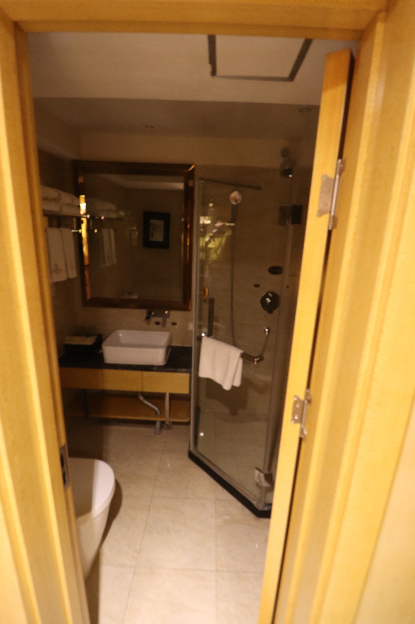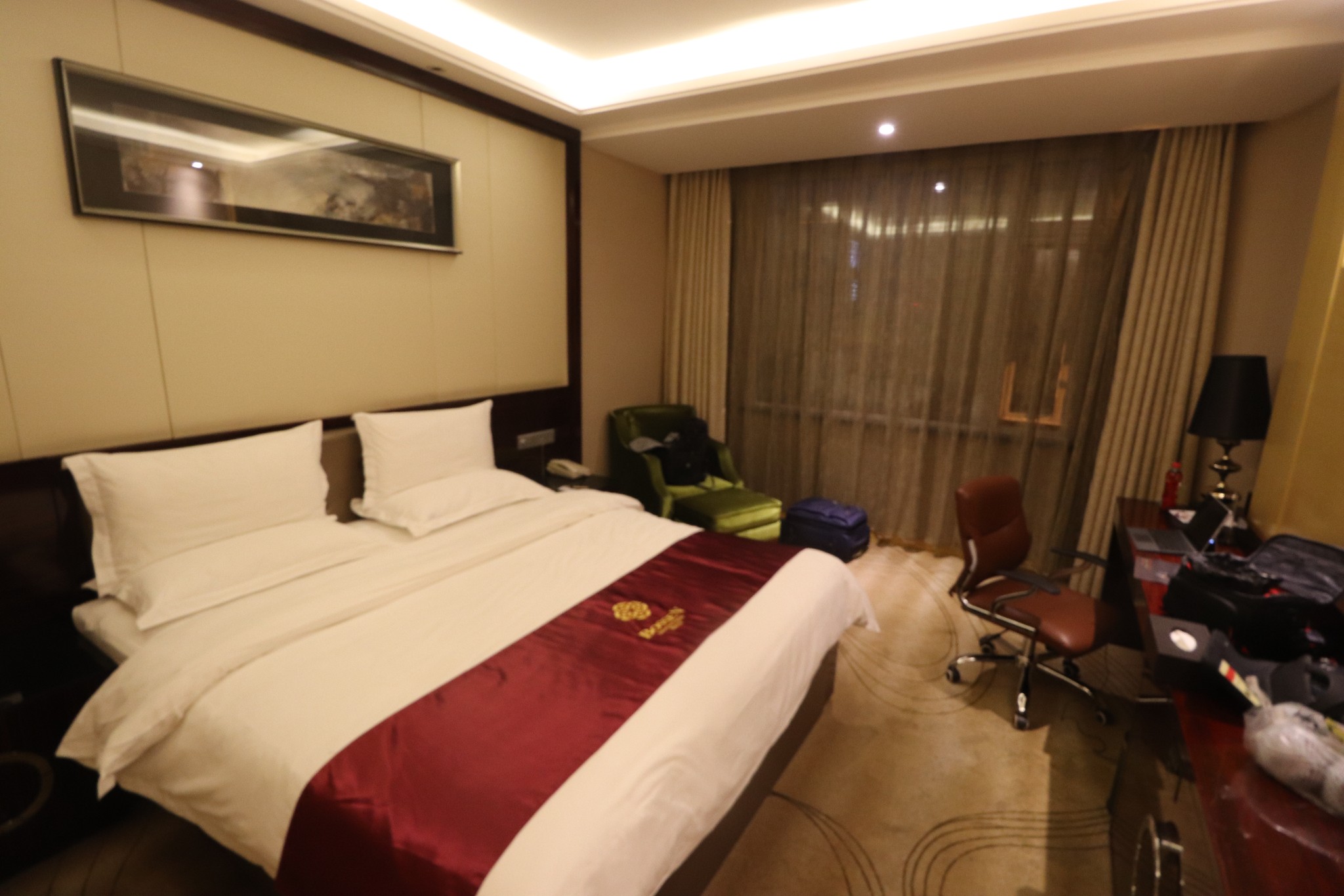 柏森国际饭店离银川市中心不远,预定的豪华大床房,500元一晚,最后一晚是475元,合计2975元。酒店客房还比较大,设施齐全,卫生干净,前台办理入住的效率很高,酒店服务态度不错。酒店分为A区和B区,是外表连在一起却互不相通的两栋楼。我住在B区,但酒店前台和餐厅都在A区。餐厅在A区2楼,要先下出B区楼,再进入A区楼然后上楼进餐厅。酒店前有停车场,内有大院方便停车。