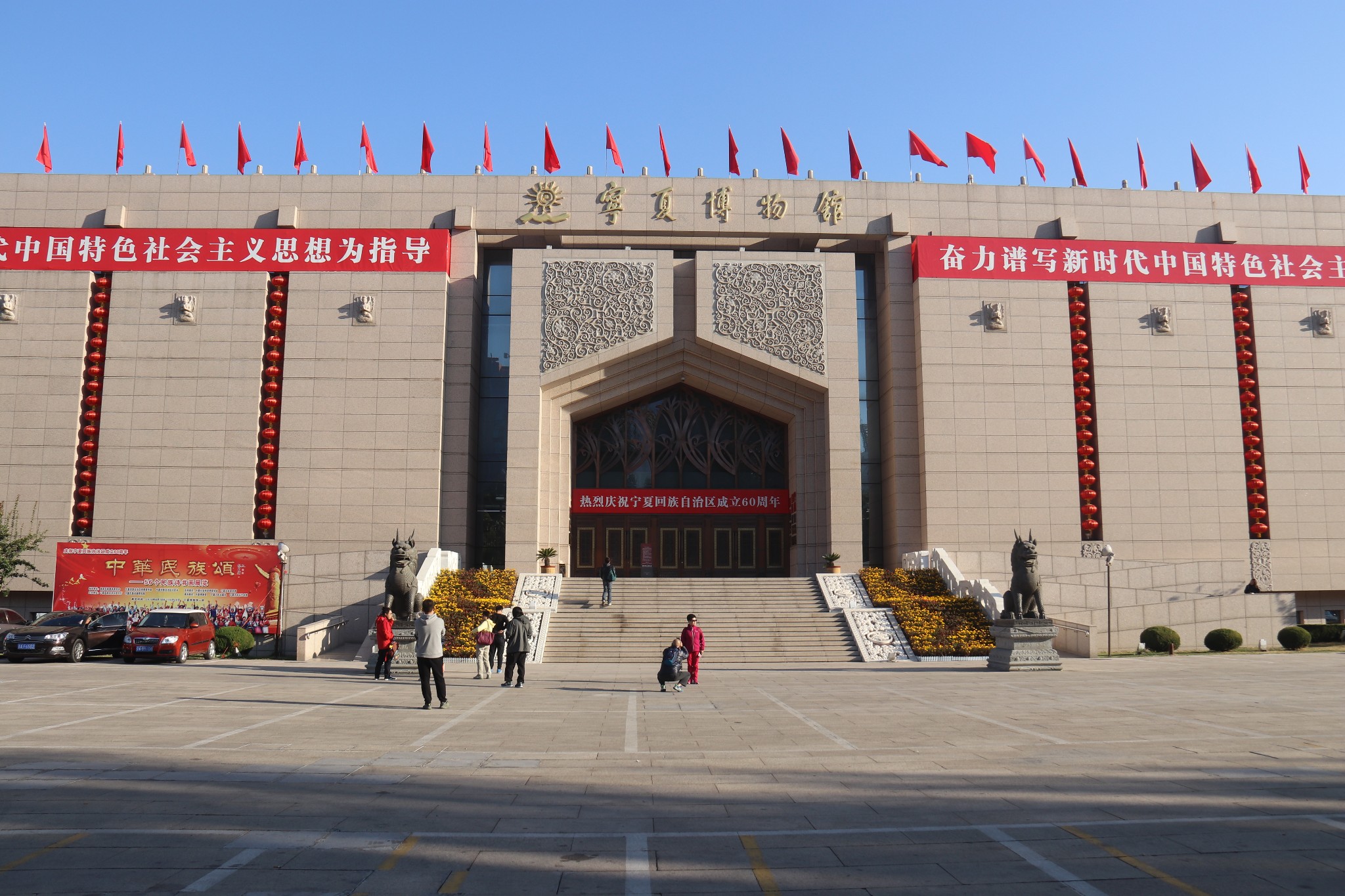 宁夏博物馆开放时间是周二到周日9点至17点,周一闭馆,国家法定节假日则正常开放。这个博物馆的大小在省级博物馆里是偏小的。大门和装饰的砖雕件上有很多宁夏出土和发现的国宝级文物图案。这里是有免费讲解的。一楼常设展览是贺兰山岩画展厅,听博物馆志愿者的讲解还是能了解到很多史前人类的观念和想法的。二楼是宁夏通史展厅。不同于蚂蜂窝攻略中的介绍,现在收藏在这里的镇馆之宝只有四件。波斯凸纹玻璃碗现在收藏在固原市博物馆。其他四件,西汉错金银铜羊,唐代胡旋舞石门扇,西夏王陵力士人像碑座,西夏鎏金铜牛都收藏在二楼的宁夏通史陈列展厅中。而西夏鎏金铜牛则是镇馆之宝之首。除此之外,很值得一看的还有隋代镂空雕刻金方牌、西夏妙音鸟脊饰、西夏八卦铜钟、王莽时代的稀有货币金错刀(一刀平五千)、西夏金菩萨像等。除此之外还有宁夏红色革命陈列。三楼的展厅中古钱币展厅还在维修,不开放,三楼走廊里有宁夏回族自治区成立60周年摄影图片展。(宁夏自治区成立于1958年10月25日)这里有语音讲解器,不过我没租。进入参观都不需要领票,免费开放。国庆假期这里人不多。
