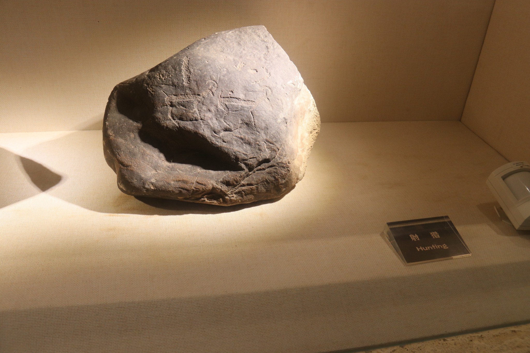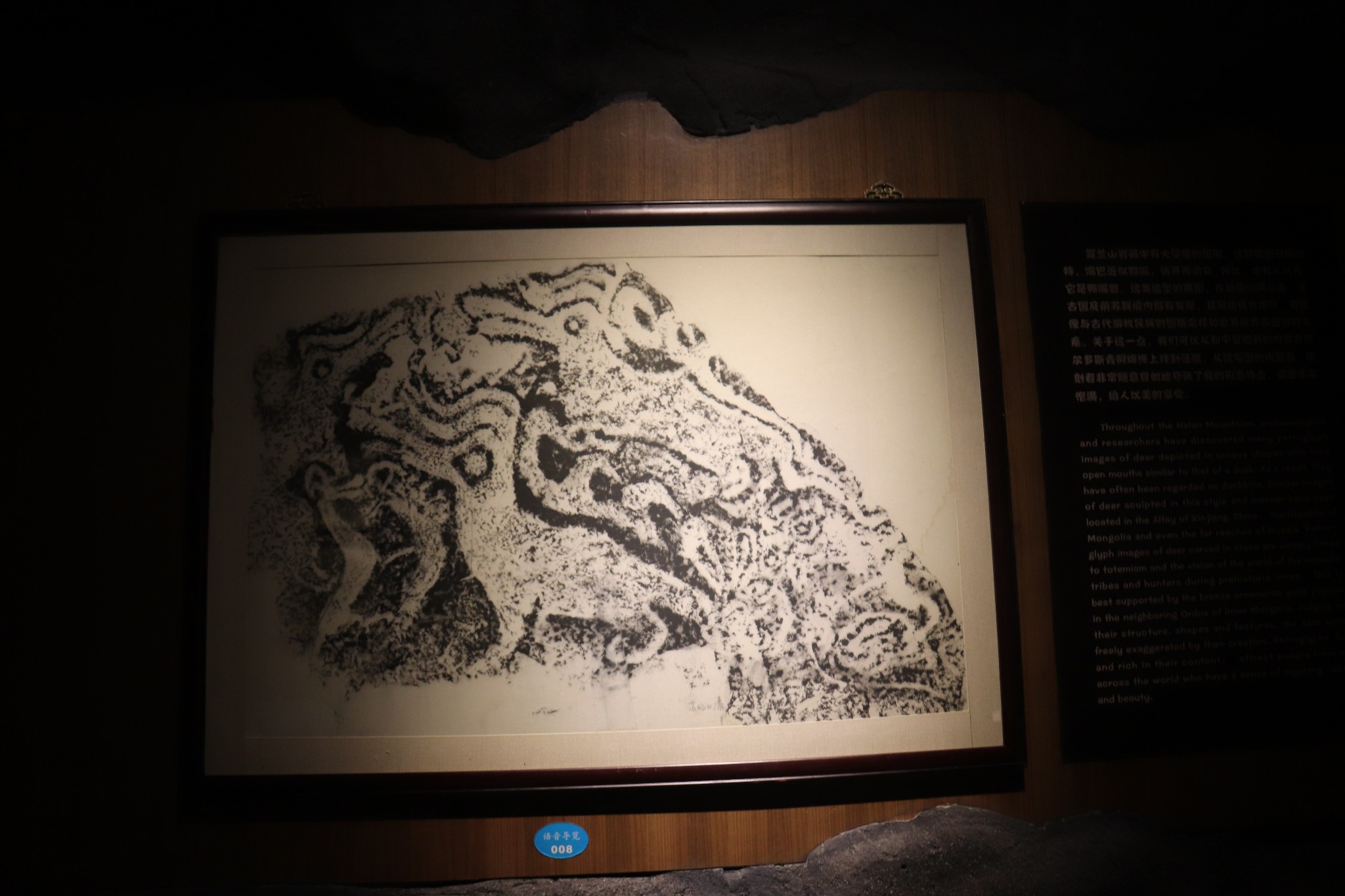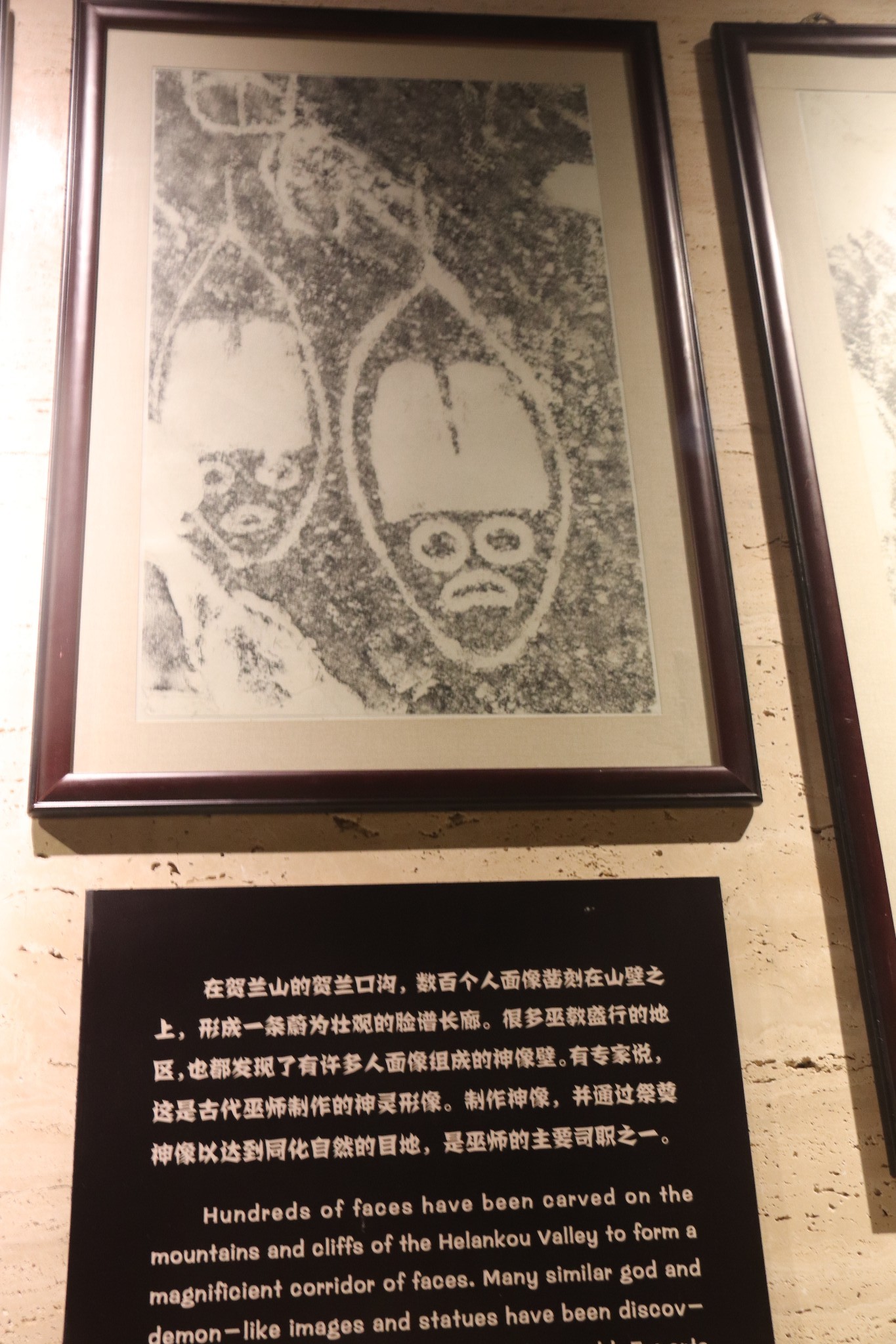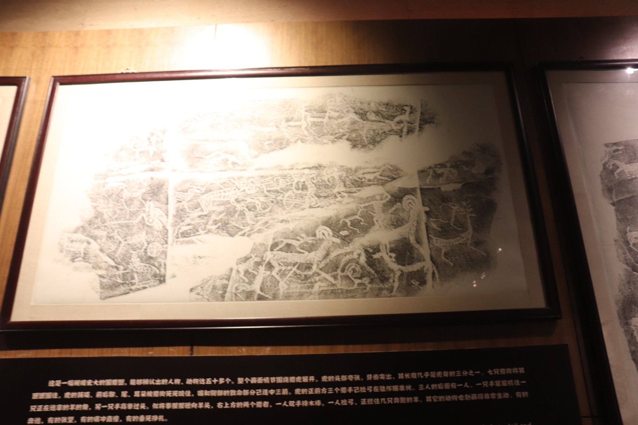 一楼唯一的常设展览是石刻史书,贺兰山岩画展厅。到这个展厅听下讲解员的讲解还是很有必要的。贺兰山脉上留存着中国最大的岩画群,根据学界主流意见,这些岩画产生于距今5000多年前,主要是距今5000-4000年前的作品。