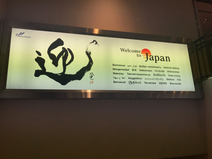 出发前一天晚上,突然手机一振,航旅纵横推送了因为台风云雀逼近大阪,延误8个小时的消息,差点崩溃,原因是本来想好的是去了当天就能下午直接去浅草寺,晚上参加隅田川花火大会。这下全玩完,而且本来想好的在成田机场JTR柜台去取订好的西瓜卡、地铁卡也会取不到(柜台22:00下班)。一个早上都在刷台风消息中渡过,好不容易下午16点起飞,到了晚上9点40下飞机。机场第一个下行电梯有欢迎指示牌,各种文字都有。