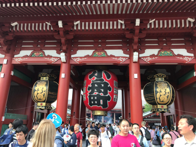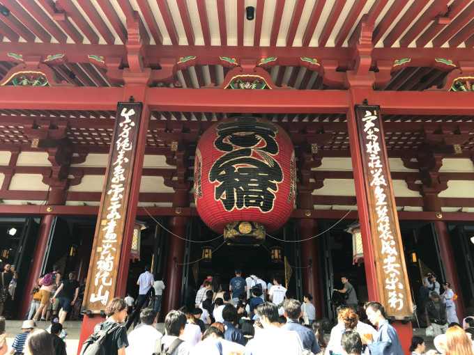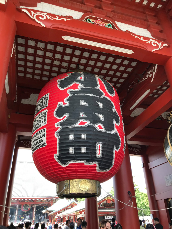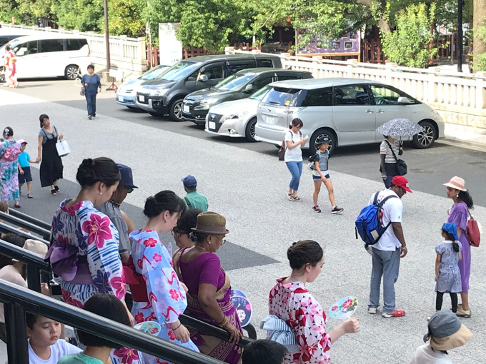 吃完饭,略作休息,前往东京游客打卡必到的浅草寺。浅草站下车后,谷歌地图提示约1.6公里,但是在大太阳底下,实际走了差不多二十多分钟,路上沿途看到花火大会指定席门票的广告,但是不知道怎么买在哪里买,也有东京都警视厅关于花火大会的交通提示。浅草寺周边环绕好几条商业街,挤挤挨挨全是游客,特别是当天因为有花火大会,穿着浴衣的女孩子络绎不绝,颜色鲜艳、装饰华丽的浴衣搭配盘起来的发髻,确实可以自动➕颜值20分,也给古老的寺庙增加了别样的风景,整个浅草寺周边都生动了起来。回到寺庙本身,浅草寺全称是金龙山浅草寺,别称浅草雷门观音寺。但是日本佛寺与国内有较大不同的是,神佛不分离,即寺庙中有神社,故浅草寺附近有浅草神社。这个特点直到明治维新后明治颁布神佛分离令以后才有所改变。还有一个区别是中国佛教寺庙主要是中轴式排列的七重伽蓝风格,重要特征是必须有山门、天王殿、大雄宝殿才能称为寺。但是日本寺庙往往占地面积较小,所以往往山门逼仄,没有天王殿,大雄宝殿规模也很小,供奉佛像既少且小,没有国内寺庙那么壮丽。 浅草寺最重要的建筑物是雷门、五重塔以及门前的仲见世商店街,但是都是六十年代复建的,并不是古迹。雷门以其那盏巨大的灯笼闻名,门前的甬道(日本将神社、寺庙前面参拜的甬道称为表参道或参道)成为了一条300米的商店街,贩售各种人形烧等小吃及纪念品。浅草寺内长年累月举办各种宗教活动,前来祈愿的人很多,寺庙也贩售各类御守。