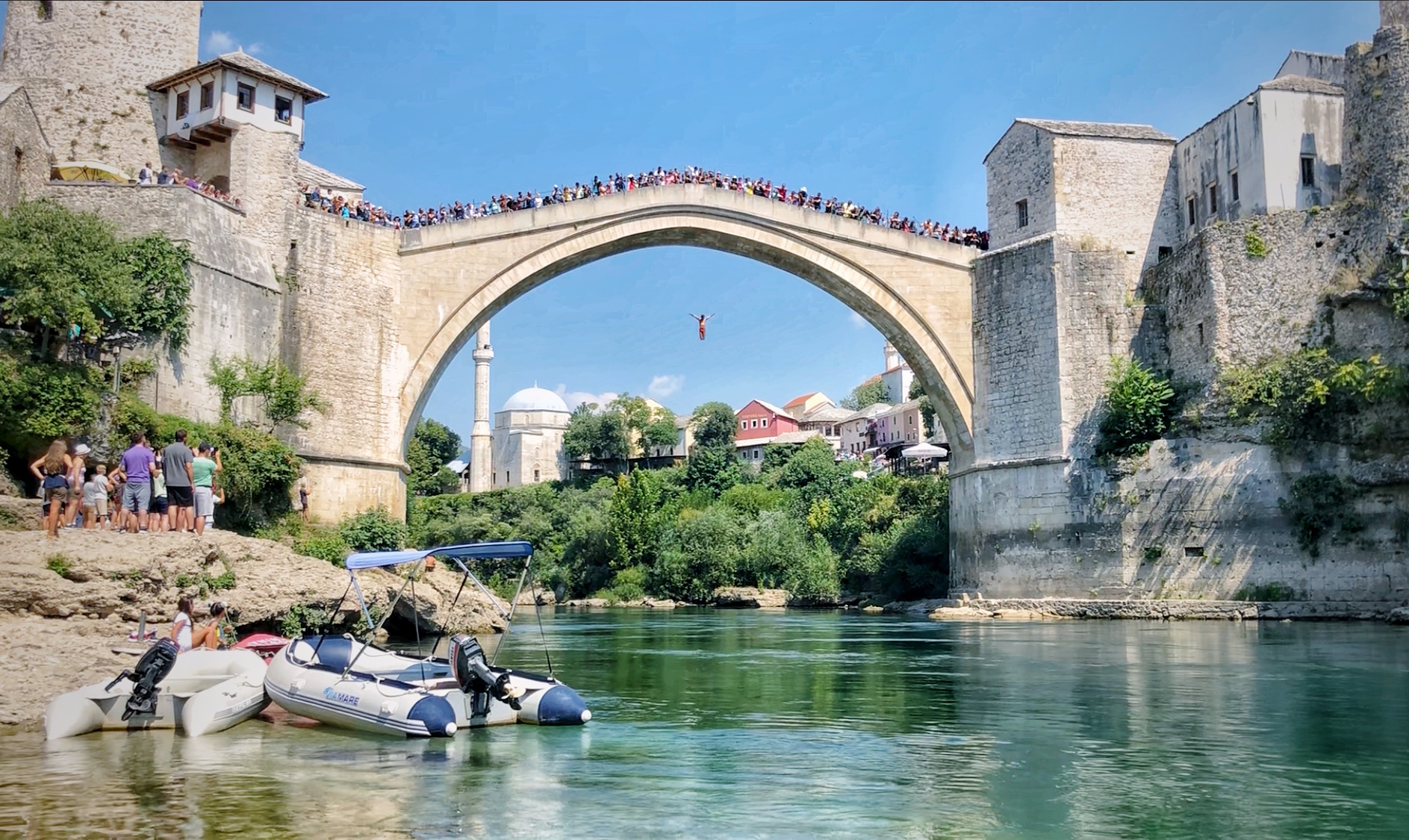 莫斯塔尔的 “跳桥者” 向冰镇汽水颜色的水面纵身一跃。