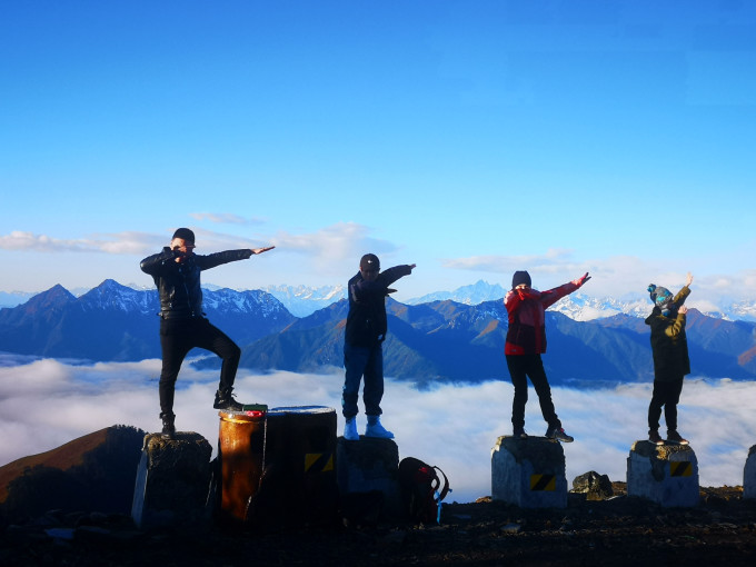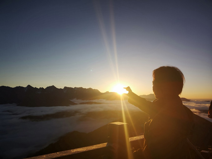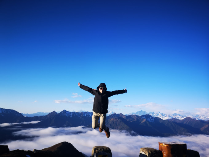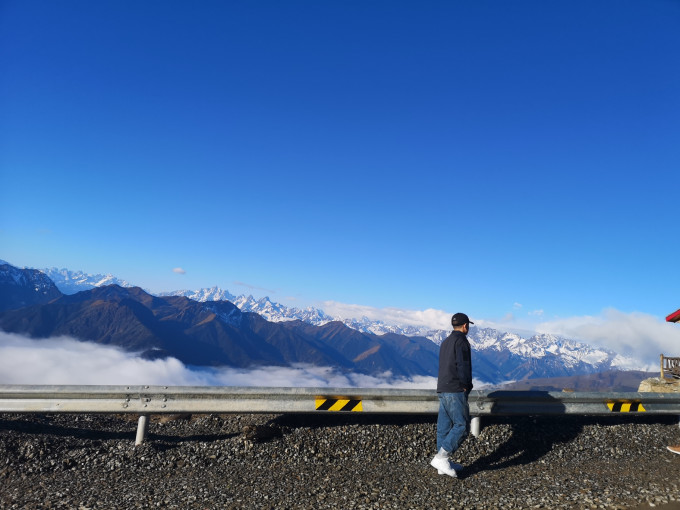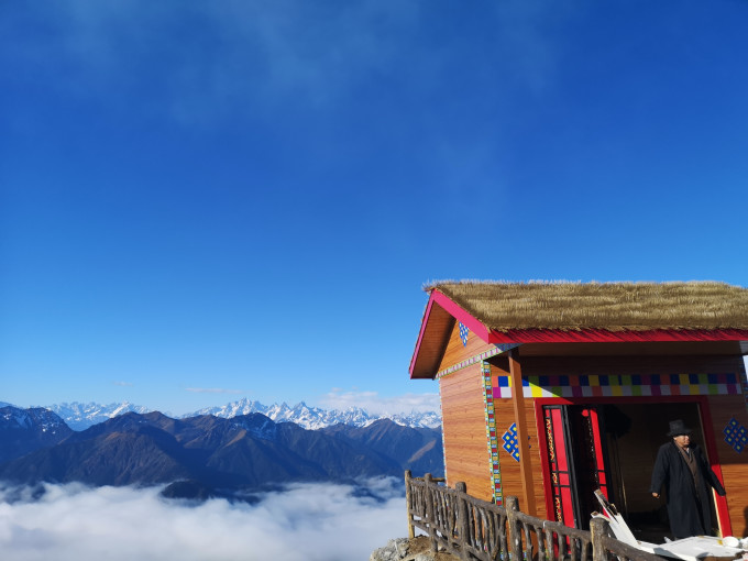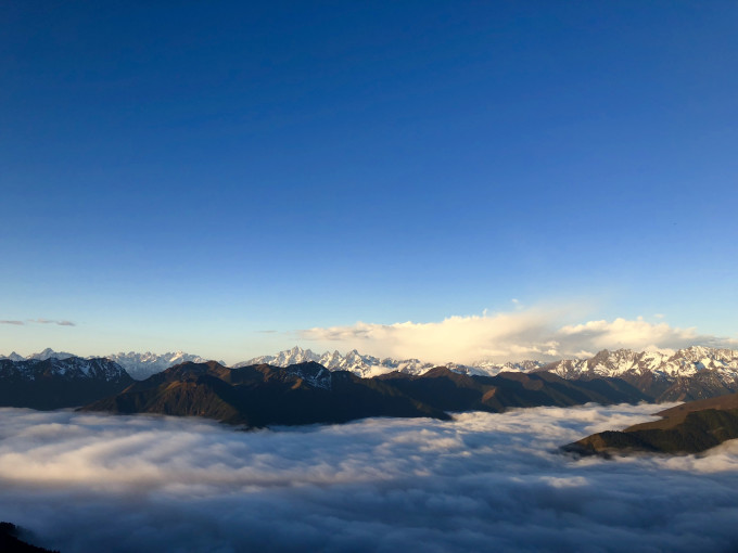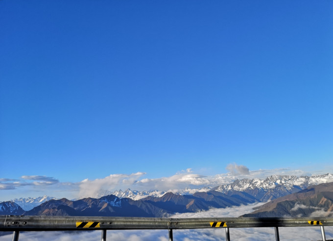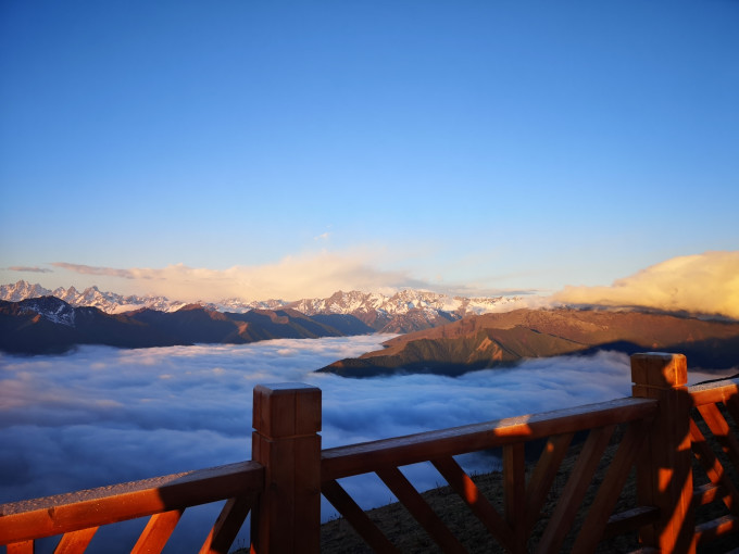 太阳出来完了,天就蓝得很巴巴适适的了。跟那个白色的云啊雪山啊就形成对比,真的很仙哦……相当想小仙女,想上天的,赶紧拍照嘛……