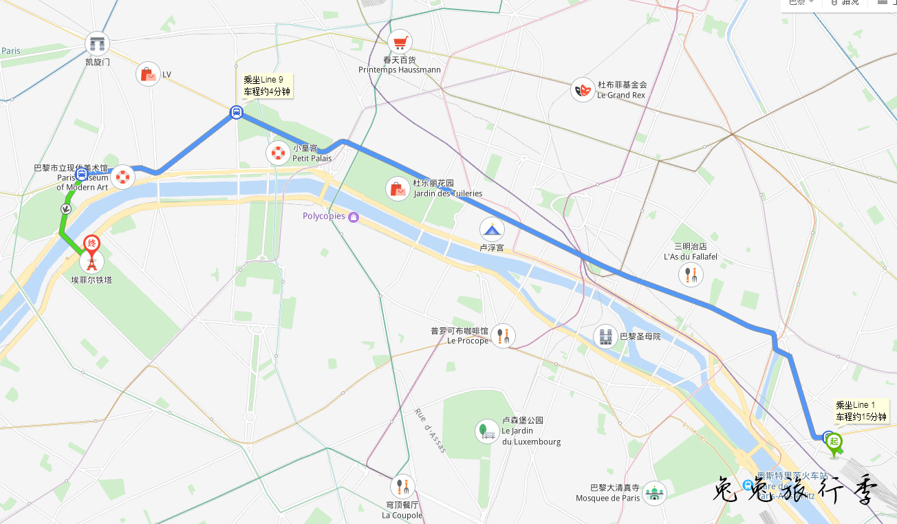 我们从里昂火车站出发,中间转一趟地铁,到达巴黎市立现代美术馆,再走上一段距离(图中绿线),就到铁塔下了。