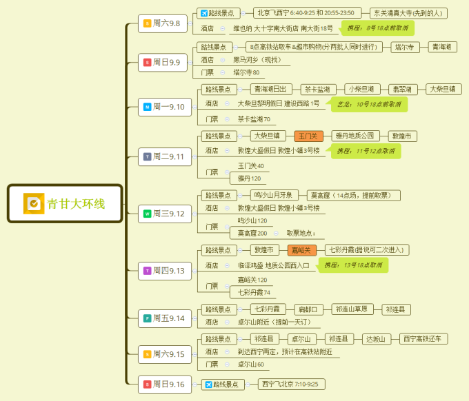 目前青甘大环线路线已经很成熟了,所以在做行程方面没有很纠结,把马蜂窝上的直接拷贝下来,查查地图,自己删删减减,就形成了下面这张图