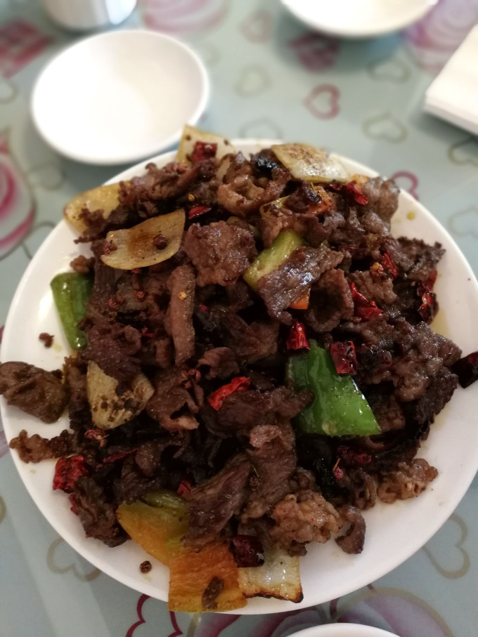 出了景区往青海湖方向开,路上找吃的,看到这家就去了,特色就是下面的炒牦牛肉,80一斤,来了一斤,又各要了一碗面片,和一份土豆,不错,牛肉很好吃,土豆也好吃,面片一般般。