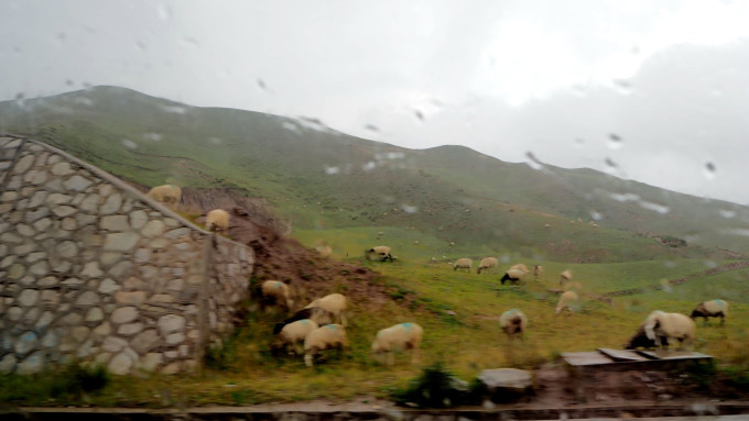 吃完中饭,就开车往青海湖走,路上又下雨了,看见放羊的,密密麻麻。齐先森说这羊肯定好吃。
