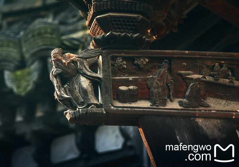 ▲卢宅肃雍堂内屋檐一角,雕刻人物生动传神,呼之欲出。