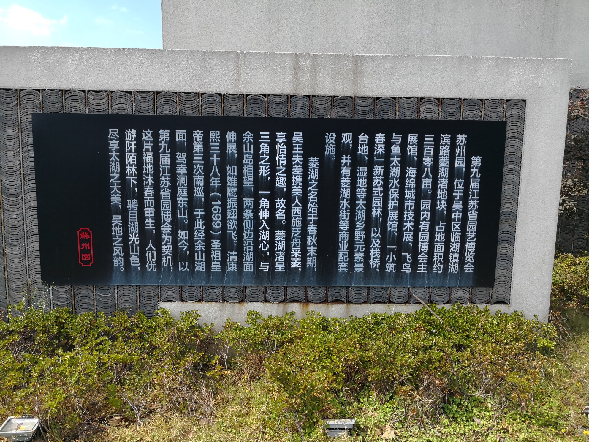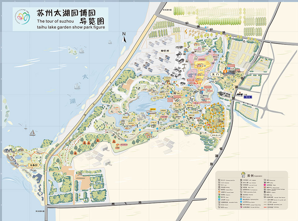 “园博园”,大名叫做“江苏省园艺博览会”,每两三年举办一次,在省内各城市轮流举办。苏州市承办的,是2016年第九届园博会,地址选在苏州西边的吴中区临湖镇。这地方坐山傍水,在东山、旺山和穹窿山的腹地。地图上看,就在太湖边、东山的入口附近。