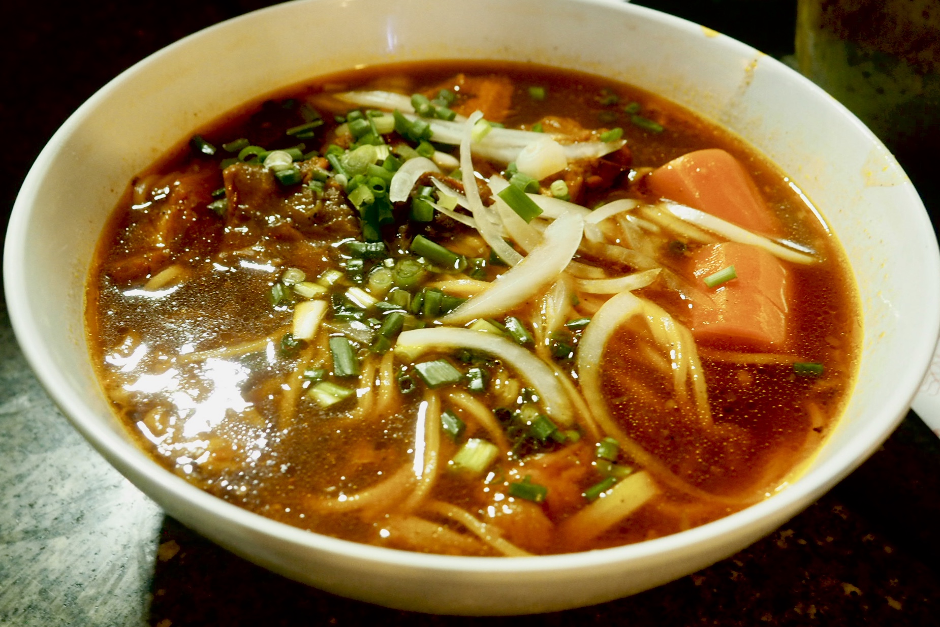 黄面量很足,超大一碗,里面还有鹌鹑蛋和虾和烤牛肉片再加上豆芽还有花生碎等调料,面很有弹性,吸溜起来十分爽口。