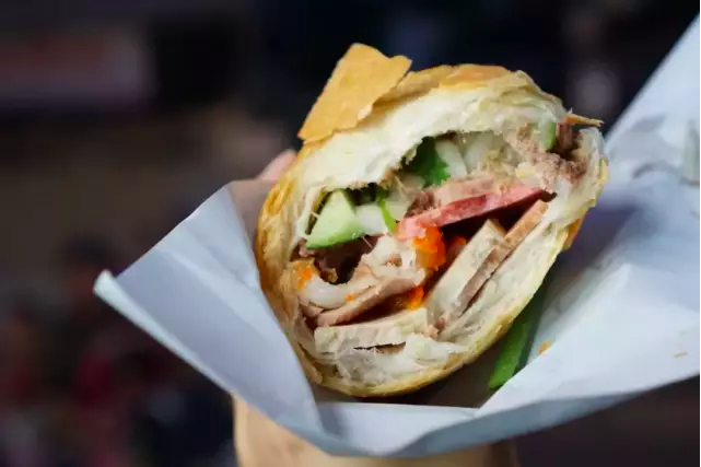 法棍是越南美食一大标志,这家店就是网红店,大家都买着打包带走,一层一层的红肠片、火腿片、肉冻片、鸡肉片叠加出丰富的层次感,咬到黄瓜豆芽的时候又有十分爽脆,里面还有猪肝酱,店员手势十分娴熟,每天销售量也是杠杠的。