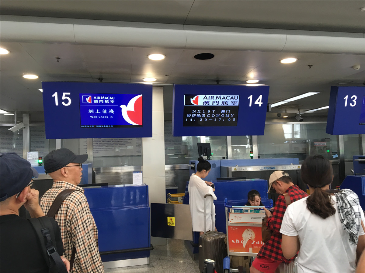 提前2个小时左右办理登机手续,这里大家要注意,澳门航空16号柜台是办理商务舱,13、14号排来葡秋闷显的是普通登机,那15号才两个人的是啥子?