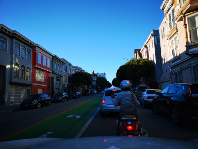初到美西,乘坐免费机场蓝线到租车柜台办理租车,提前预习了美国交通法规,却也被旧金山的路况惊到了,上下起伏的路面,无比多的STOP标识,路中间的自行车专用道,限速与各种停车标识......