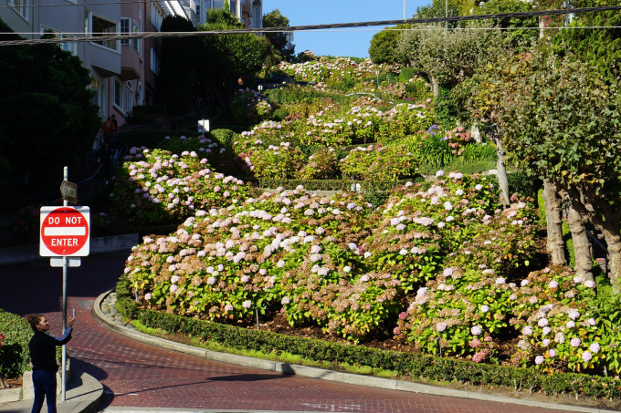 九曲花街是一条西向东的单行线,两侧是茂盛的花丛,车从弯弯曲曲的车道慢慢行驶下来,是一道特别的风景。一早一顿爬坡跑到九曲花街西头(坡度较大,一定要穿运动鞋),也就是最高处,能看到远处的海,穿过花海,与高高低低颜色各异的房屋交相辉映,行人可以从两侧楼梯走下去的。坐标(37.802194,-122.418722)