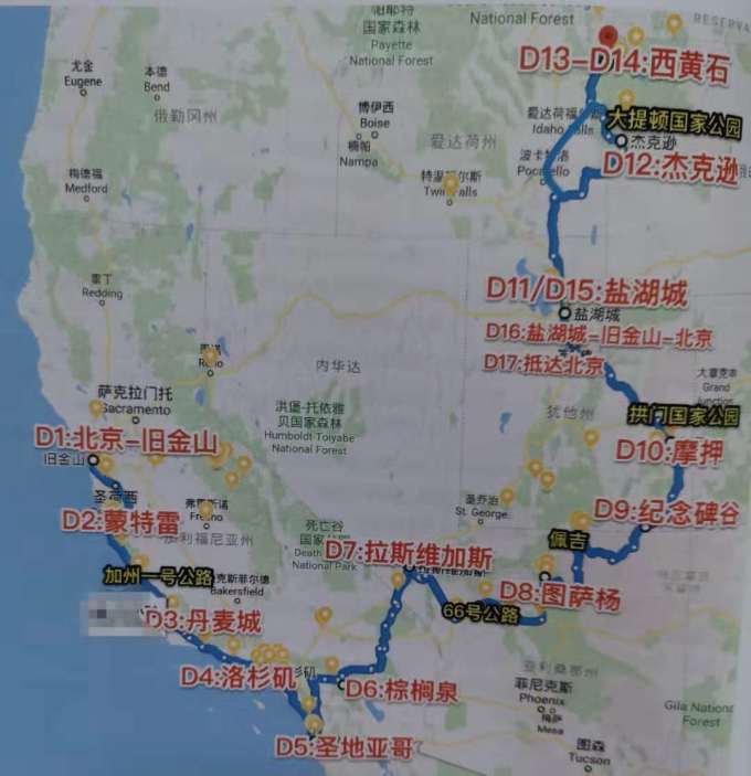 地图,全程U字型,D1-D5沿一号公路自驾欣赏醉美西海岸,D6-D10沙漠戈壁峡谷地貌欣赏最野性最具西部特色的美国,D11-D15雪山湖水森林野生动物欣赏最大气国家公园,随处都能拍出大片的你,值得我慢慢探索!
