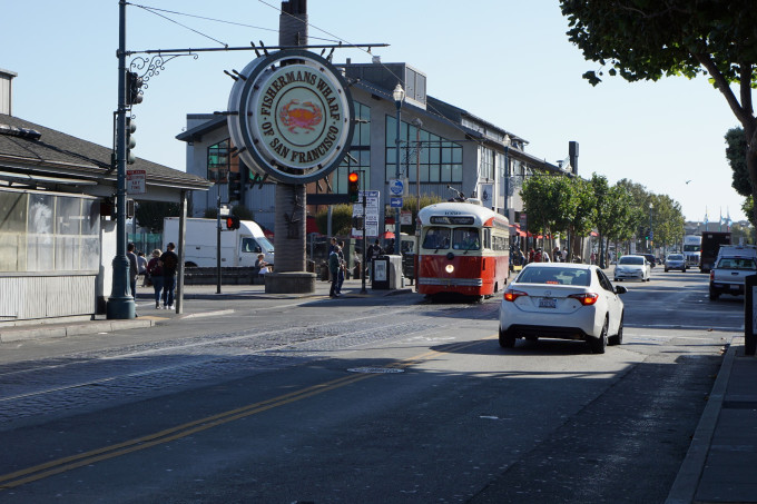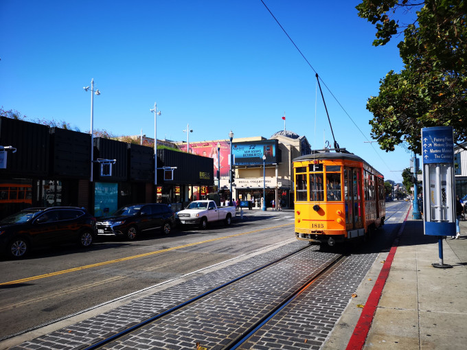 渔人码头的标识是一个画有大螃蟹的圆形广告牌,找到了“大螃蟹”,就到了渔人码头,也就到了旧金山品尝新鲜的首选地点。电车、铛铛车时而出现,很有年代感带入。