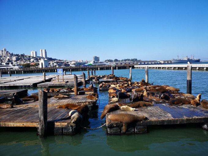 39号码头,不只有帆船游艇,更是有一群可爱懒洋洋的海狮,时而跃入水中嬉戏,时而趴在浮板上哼哼,丝毫不在意对面人们的目光。
