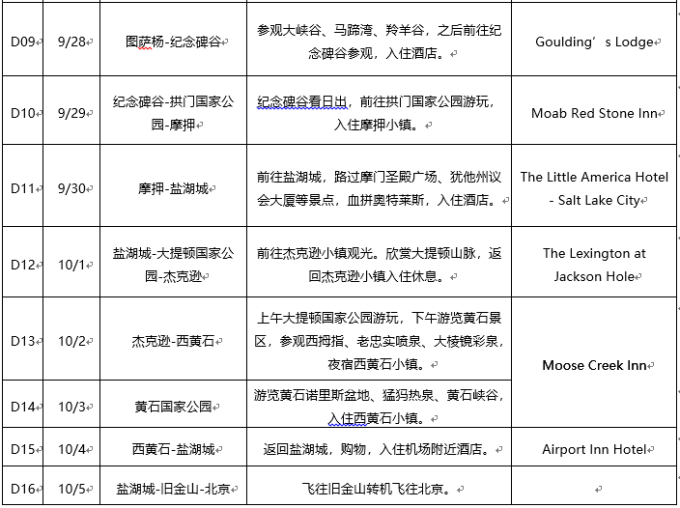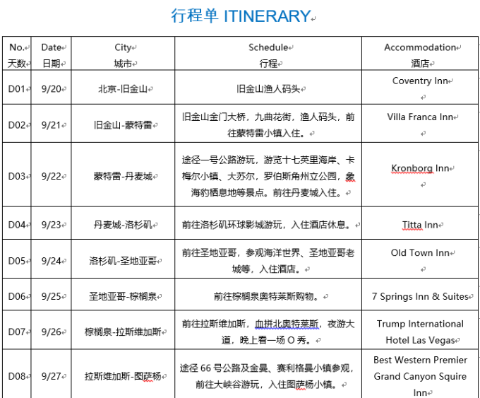目的地:旧金山—1号公路—洛杉矶—圣迭戈—棕榈泉—拉斯维加斯—66号公路—大峡谷国家公园—马蹄湾—下羚羊谷—纪念碑谷—拱门国家公园—盐湖城—大提顿国家公园—黄石国家公园—3家奥特莱斯。