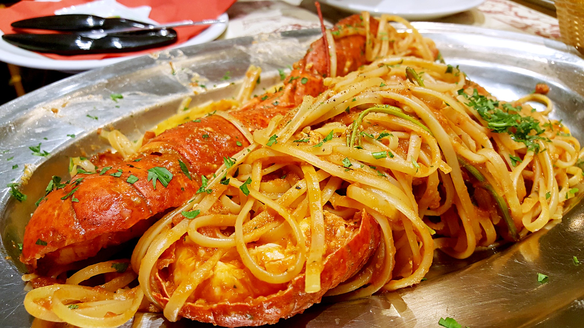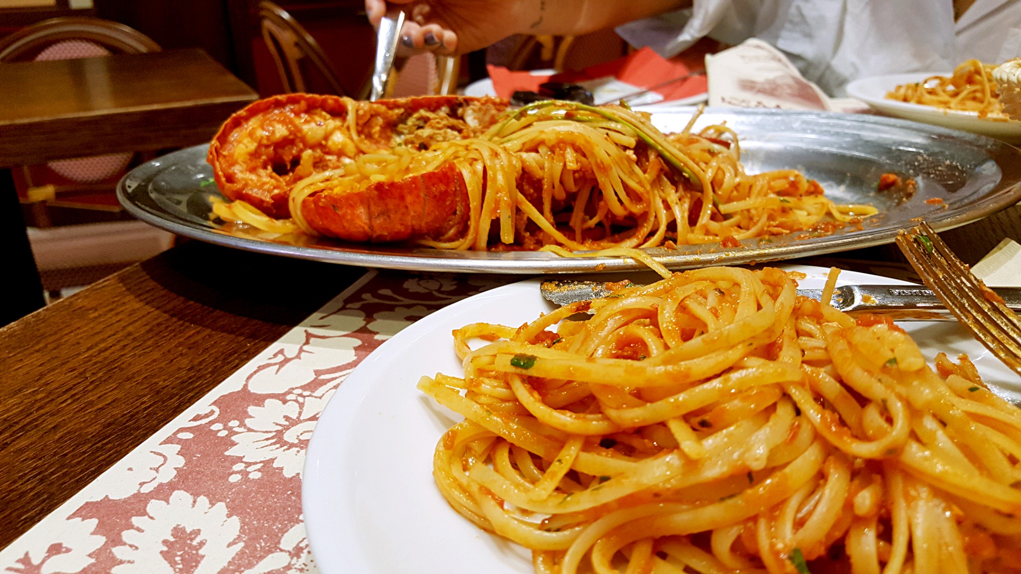 龙虾面是两人份的,一整只龙虾对切开经过烘烤,虾头熬汤做面酱。讲究。面条为了迎合大部分人口味做的是全熟的(意大利人喜欢吃中间夹生的面条,其实我也喜欢)。为了让面条全熟所以在酱汁里煮的时间更久。所以虾的味道也都煮进了面里。非常入味。