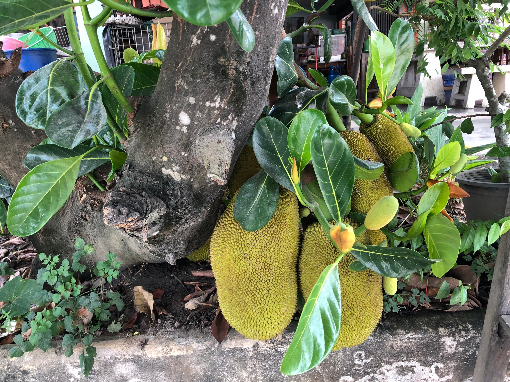 10点过司机停车吃饭,也不知是早饭还是午饭,我们下车休息,意外发现路边花台的菠萝蜜果实累累。