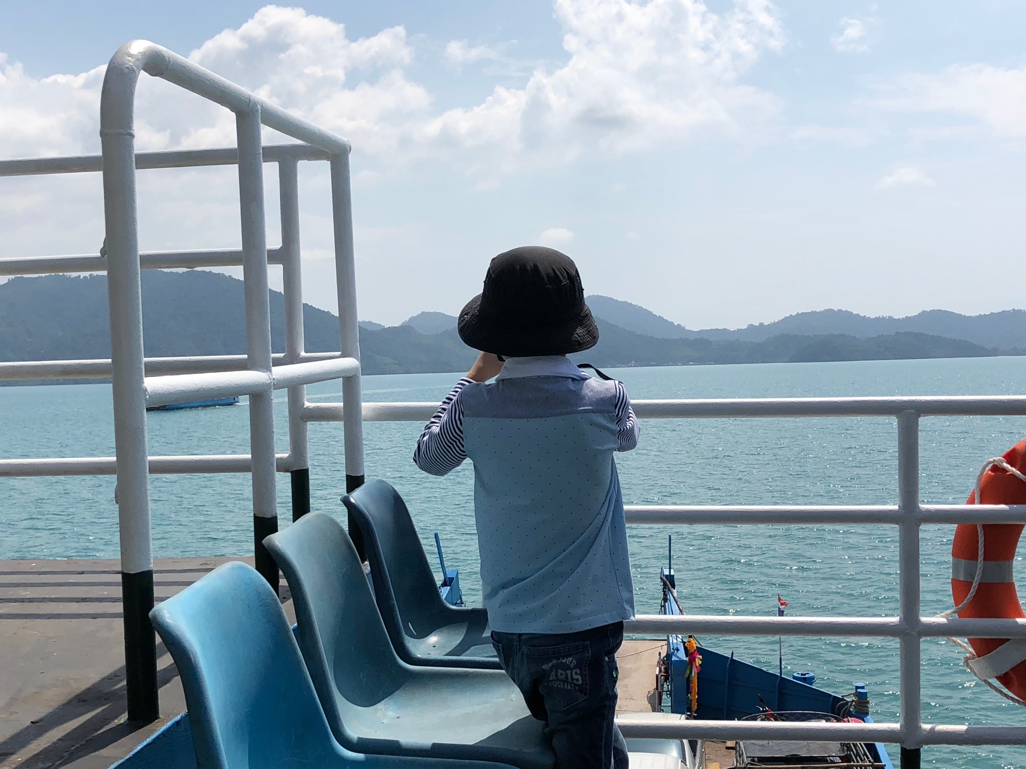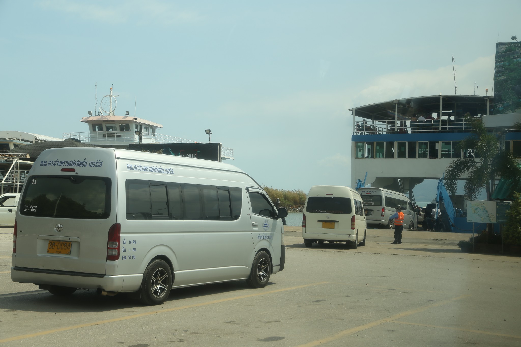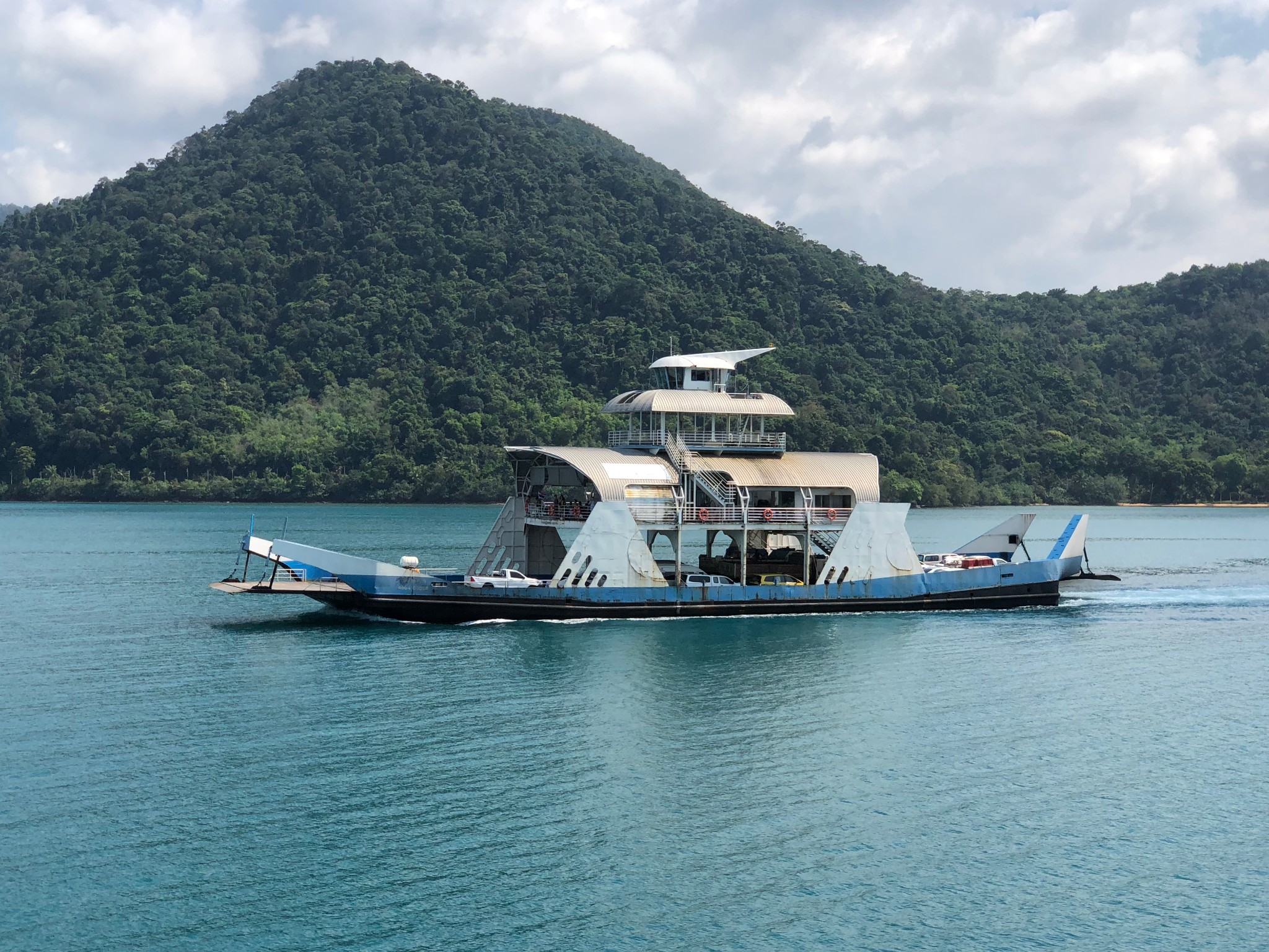 斜卡在船尾的那辆面包车就是我们坐的车,司机手艺可真不错,最后一辆,恰恰挤进来,紧紧挨着柱子和旁车,我们下车都不方便。车上船后,乘客下车前往二层、三层,二层是室内,视野有限,三层搭了个遮阳棚,可边吹着海风边欣赏美景。