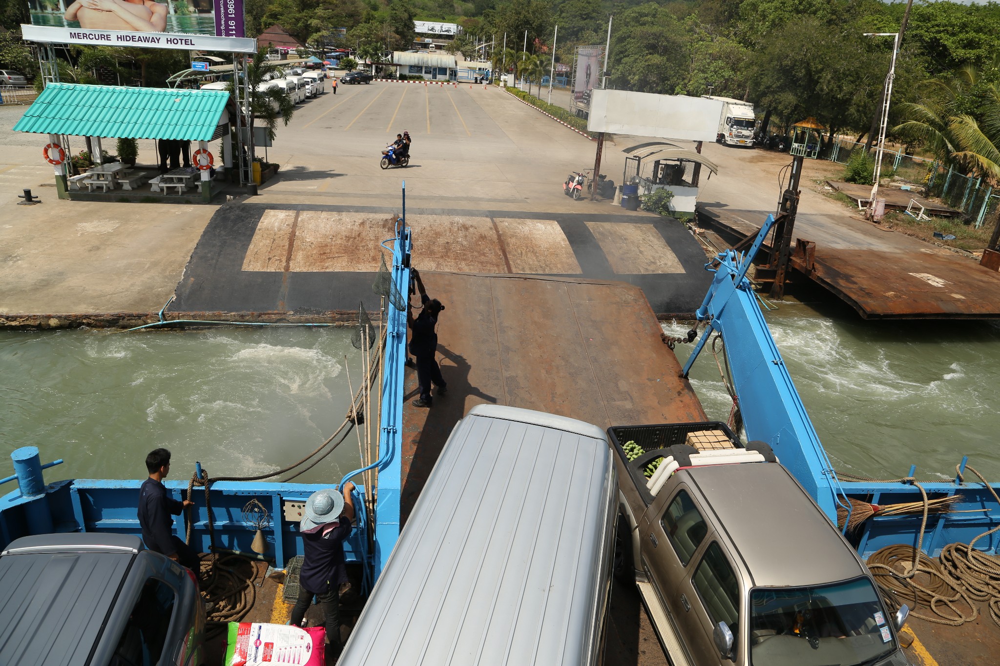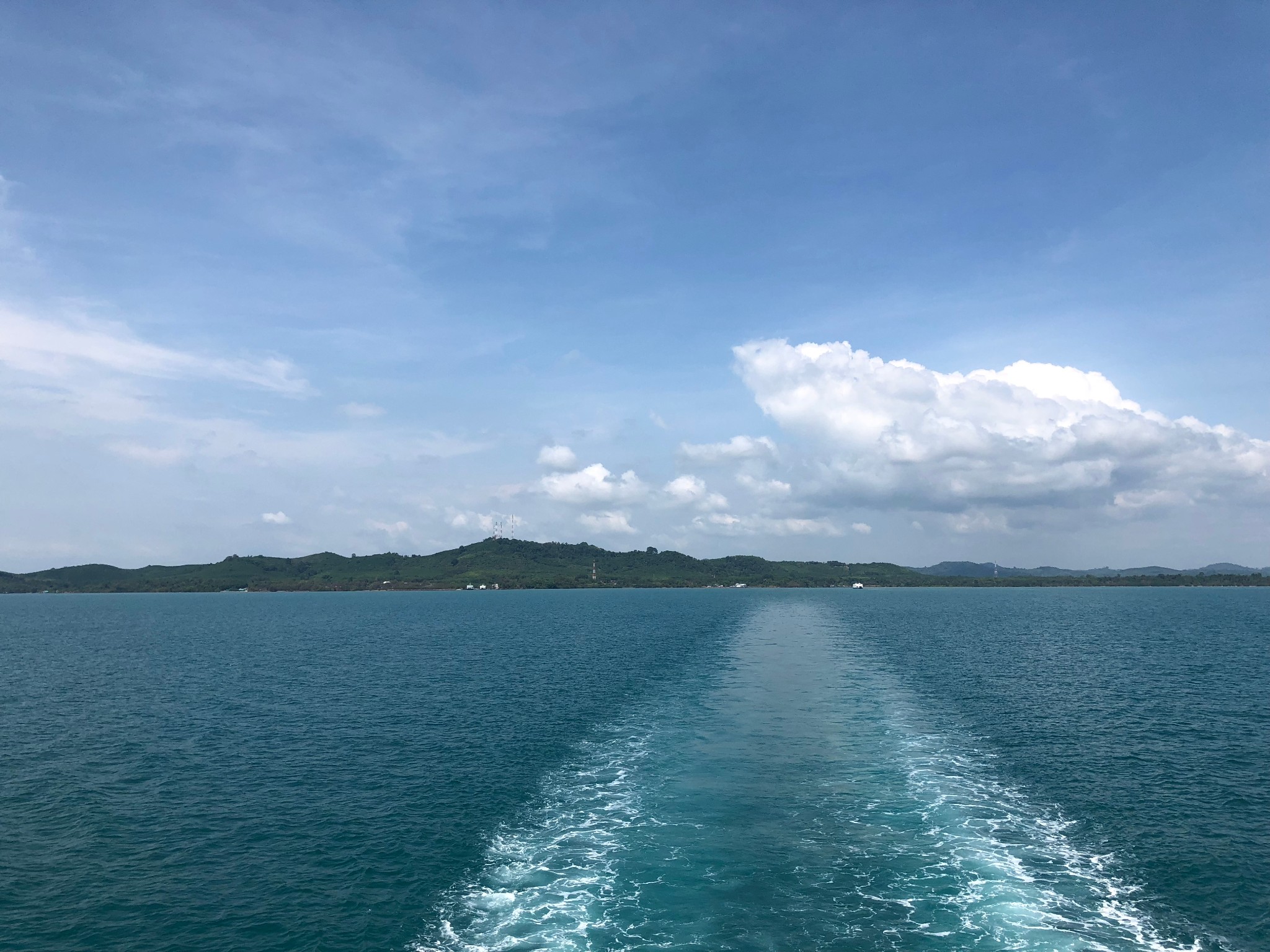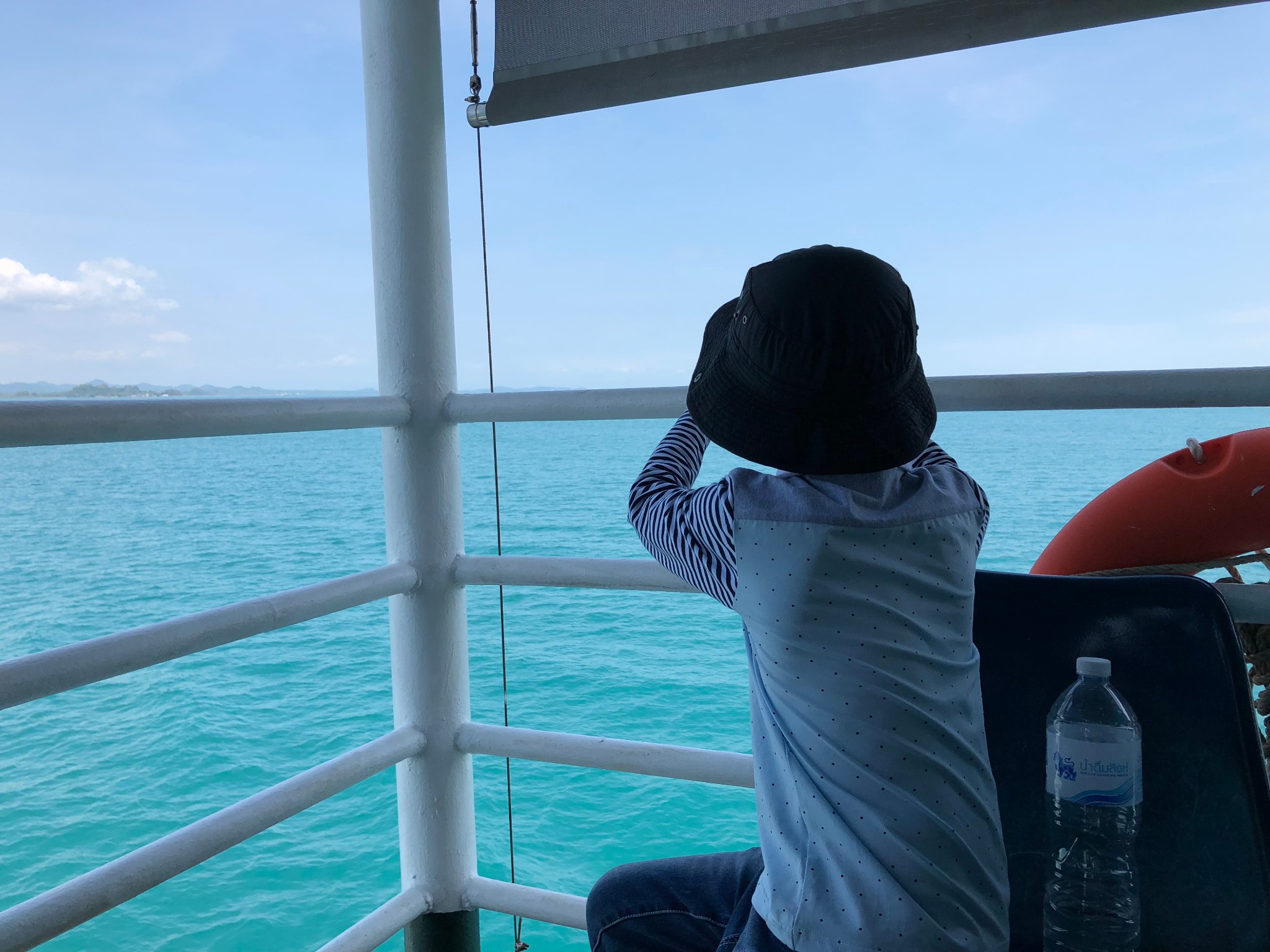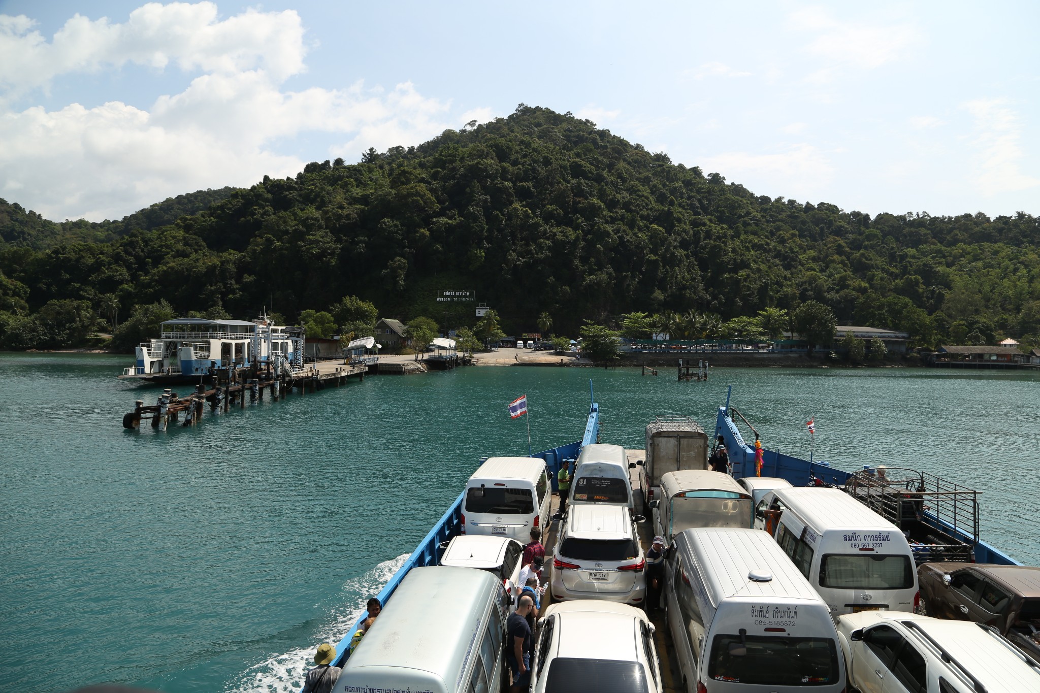 斜卡在船尾的那辆面包车就是我们坐的车,司机手艺可真不错,最后一辆,恰恰挤进来,紧紧挨着柱子和旁车,我们下车都不方便。车上船后,乘客下车前往二层、三层,二层是室内,视野有限,三层搭了个遮阳棚,可边吹着海风边欣赏美景。