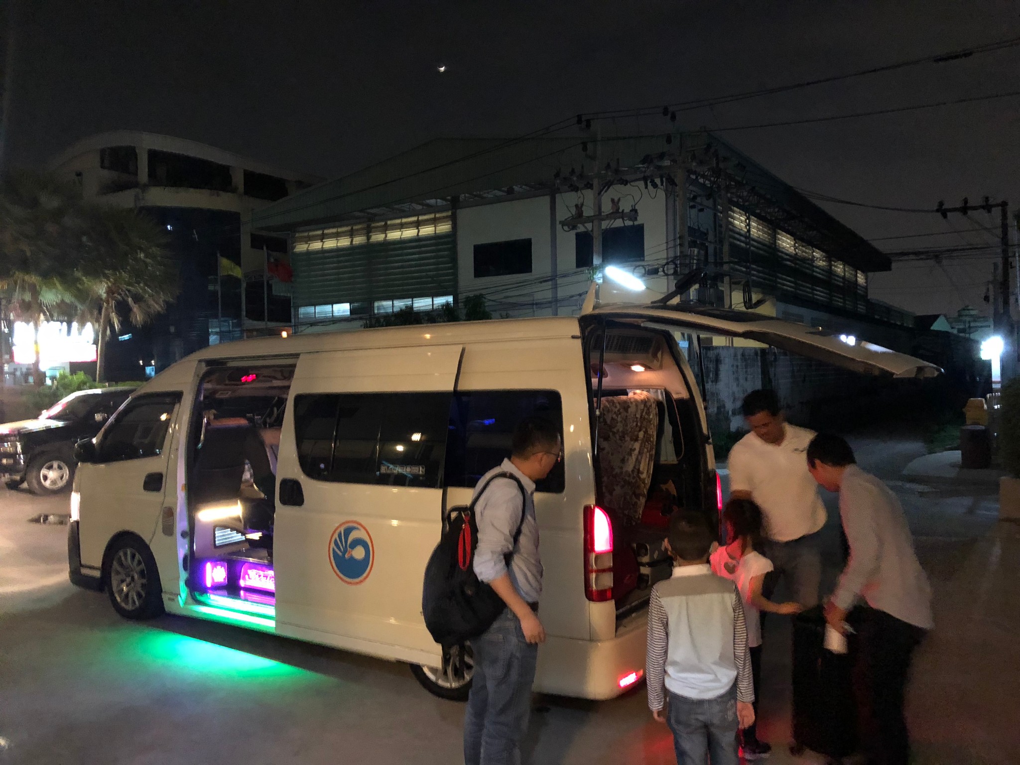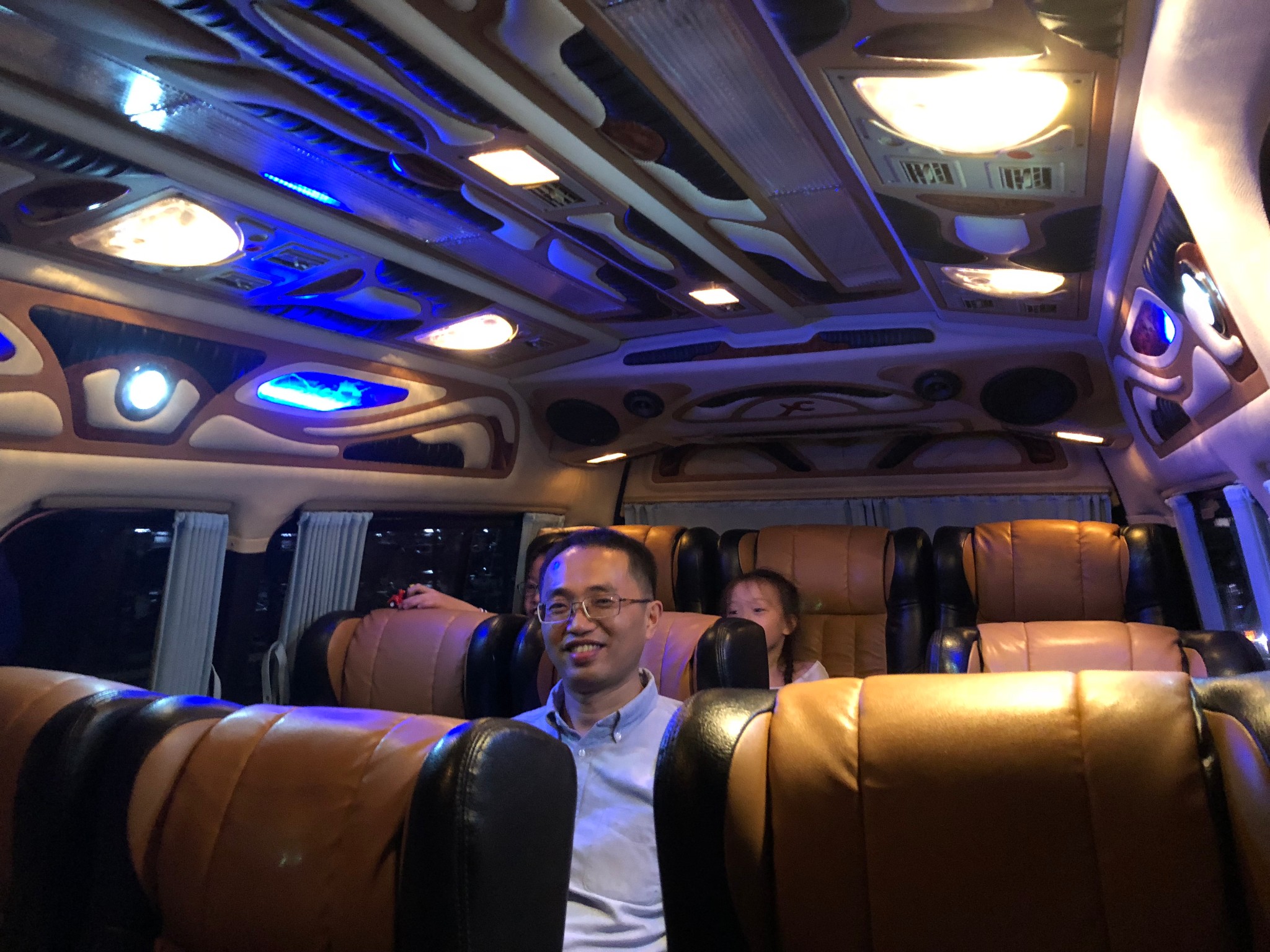 原定的九座车变得成十二座的保姆车,对我们五个人来说太宽敞了,车内饰一如既往的花哨。