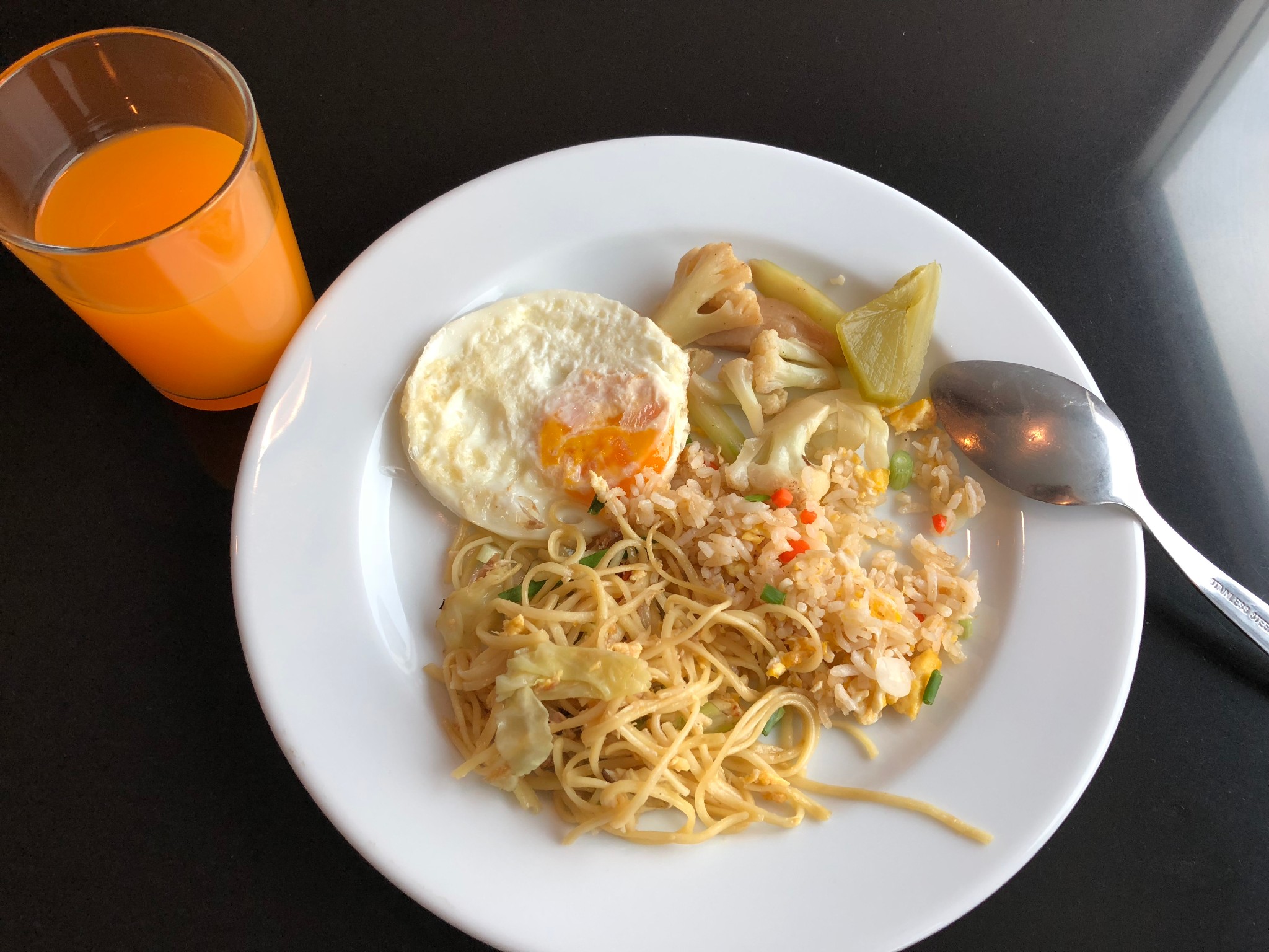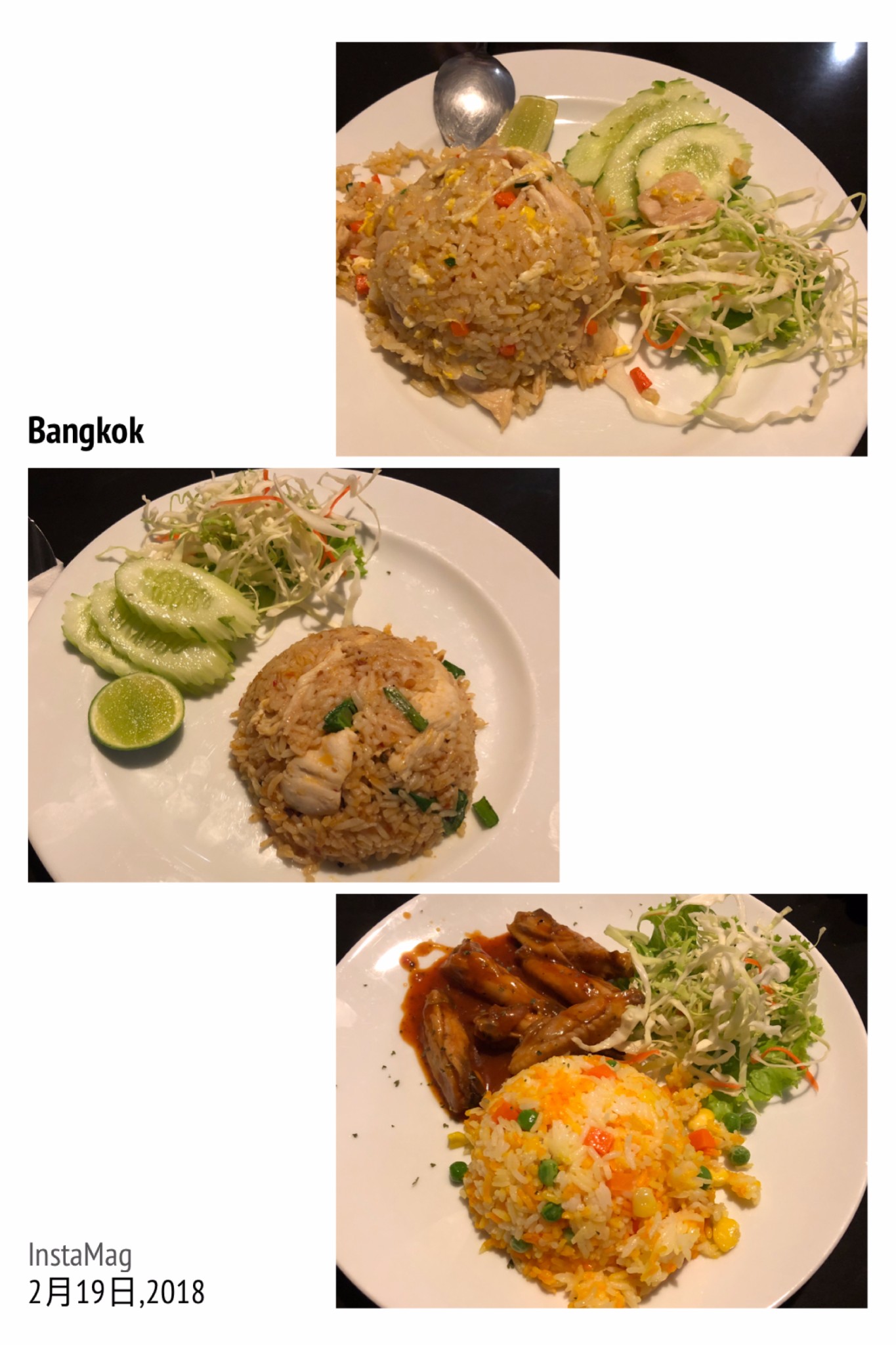 外面巷子黑漆漆的,据说还有不少狗,打消了我们出外觅食的念头。酒店一楼餐厅用晚餐,餐厅开放至深夜,随意选了三种炒饭加饮料,合计480泰铢,其中烤翅炒饭(150铢)最好吃。