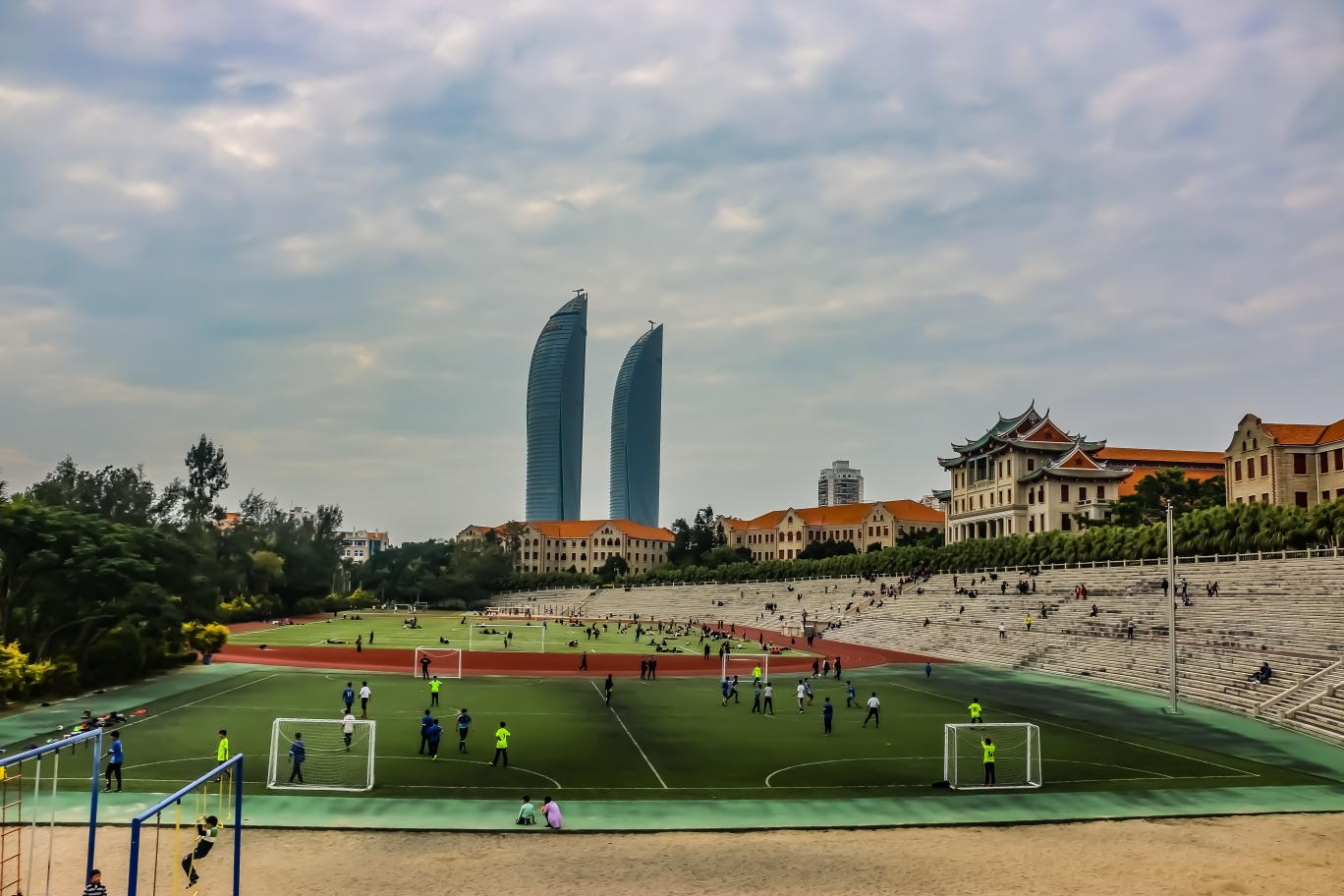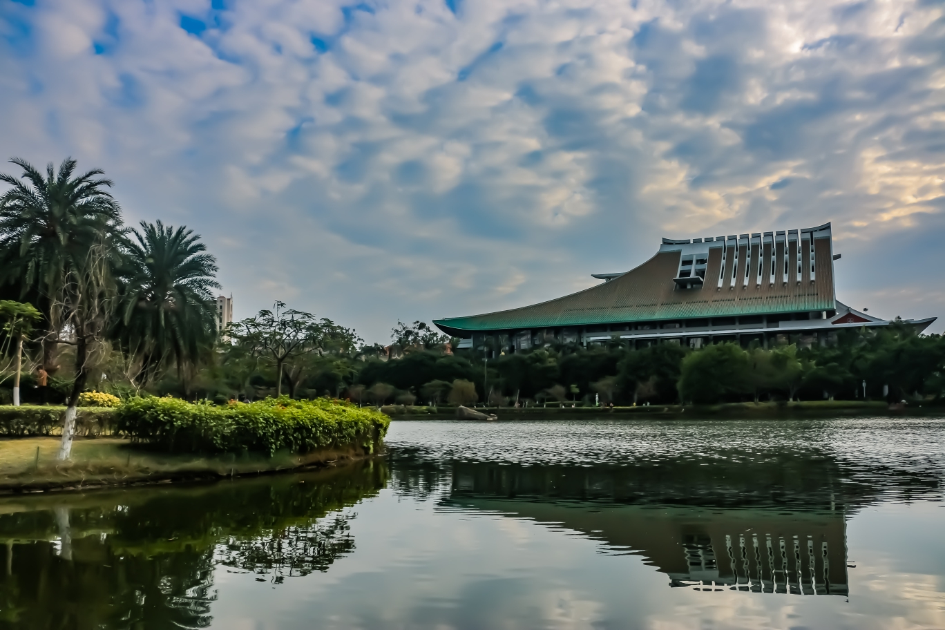 嘉庚建筑作为厦大的一大看点,创始人陈嘉庚先生亲自创造了这种“土洋结合”的建筑风格,它是西洋式的楼身与闽南传统的歇山顶燕尾屋顶相结合,因此被形象的称为“穿西装,戴斗笠”。