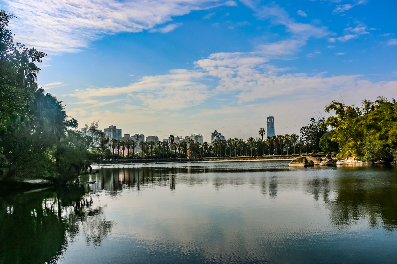 入大门不远,就是这个“万石湖”,湖不大,湖面有假山凉亭,远远的望出去,在棕榈树的掩映下就是城市高高低低的摩天楼
