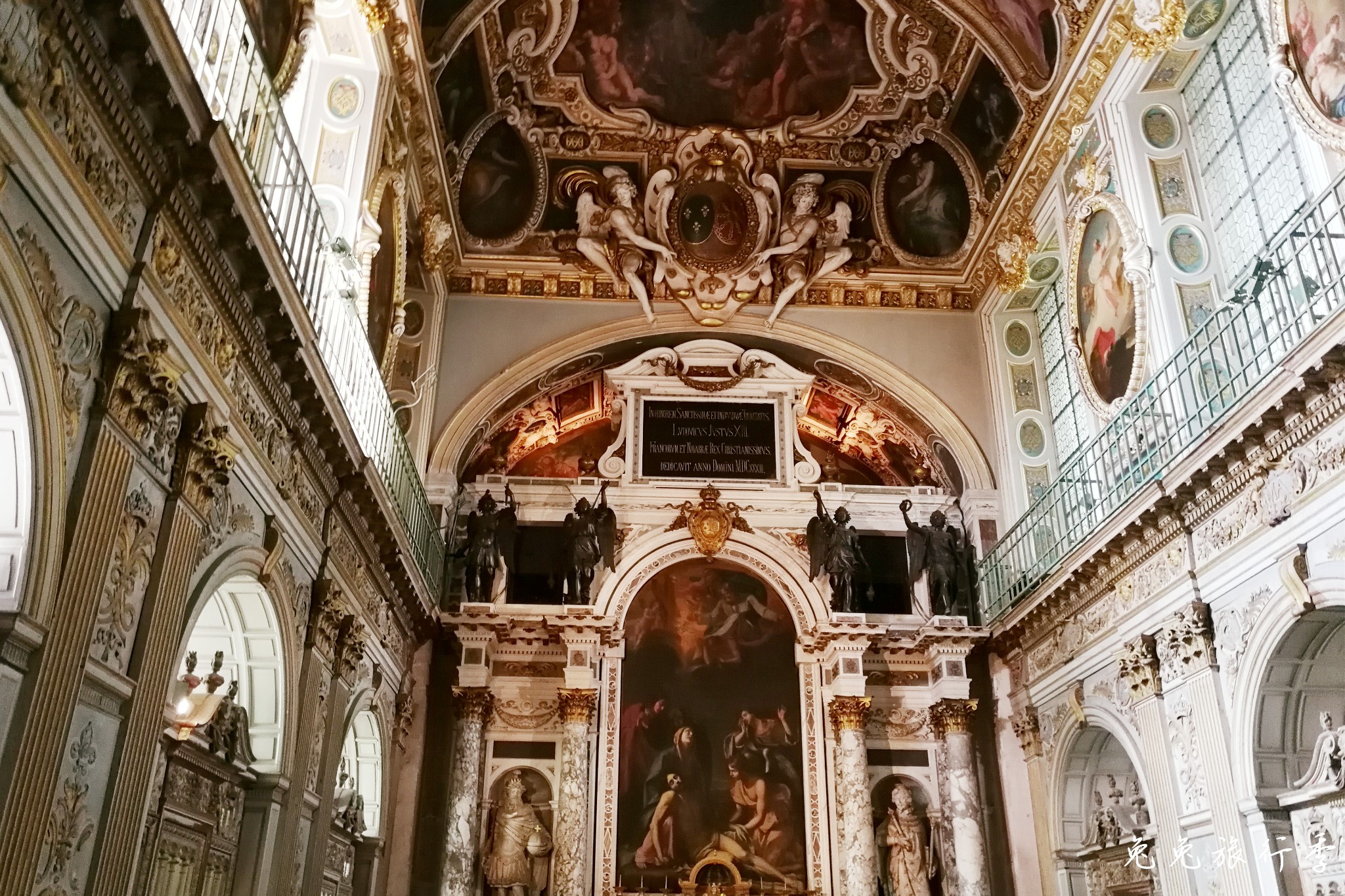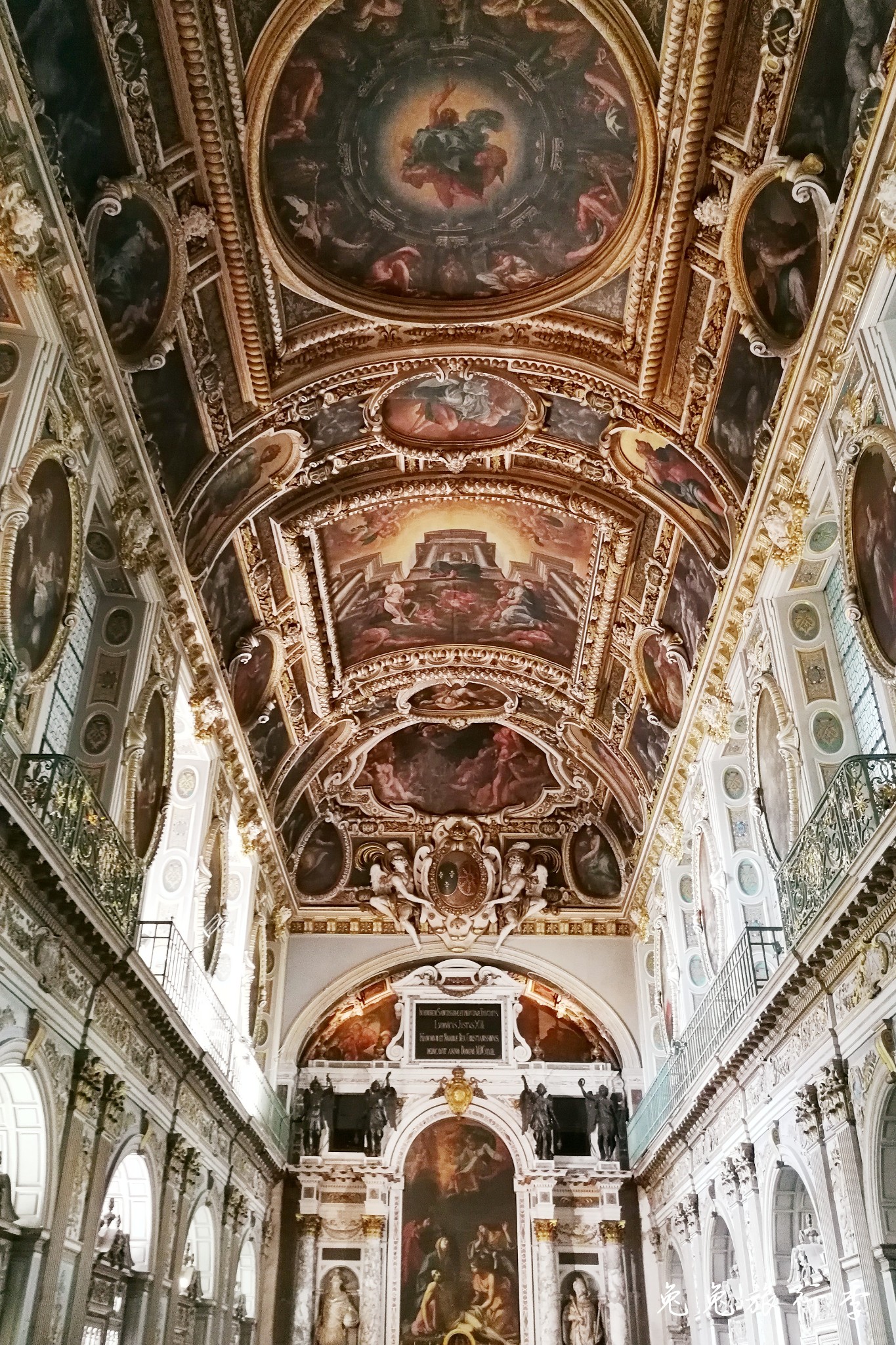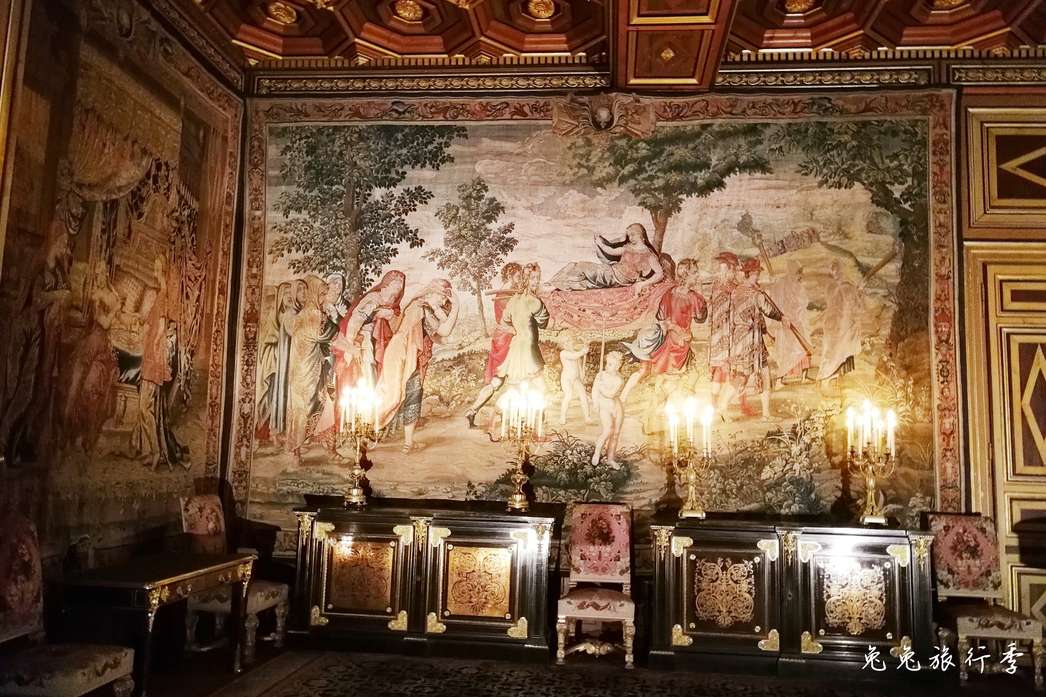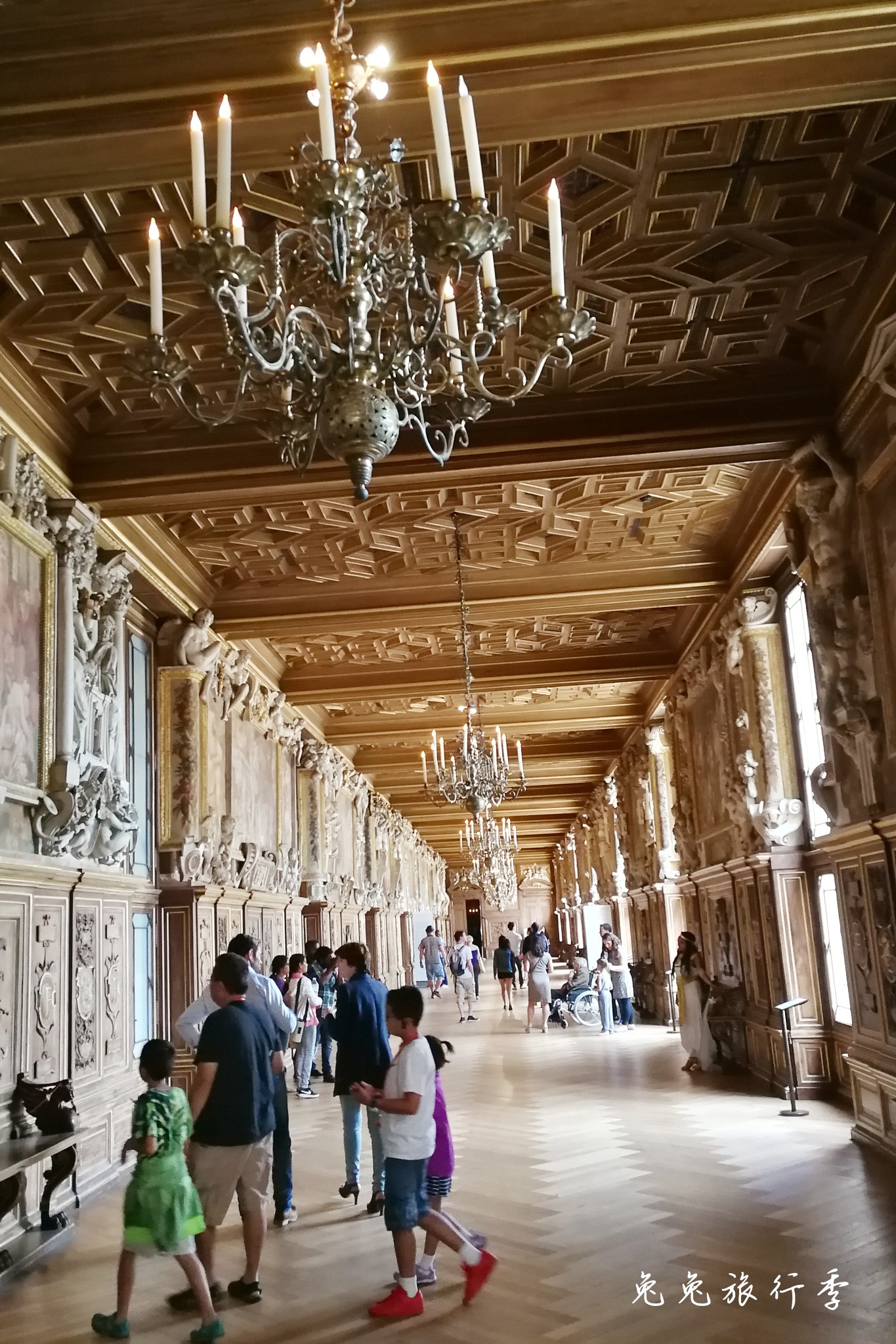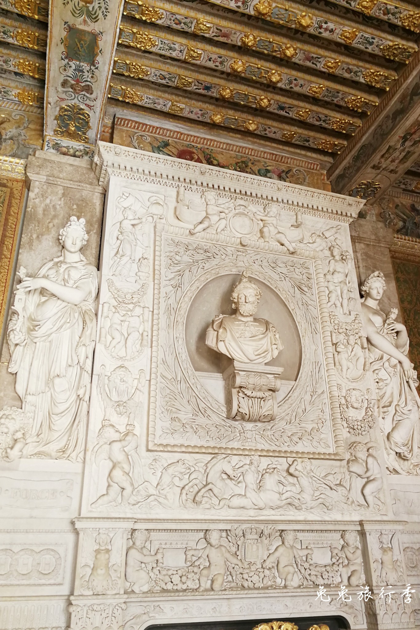 推开这扇雕刻精致的门,就是枫丹白露宫久负盛名的弗朗索瓦一世长廊,当时是为了连接新旧两座宫殿而建。热衷艺术的国王弗朗索瓦一世请来了多名意大利艺术家,将此长廊雕琢地金碧辉煌,因而这里仍保留有浓郁的文艺复新时期风格,第一代枫丹白露画派也来源于此。