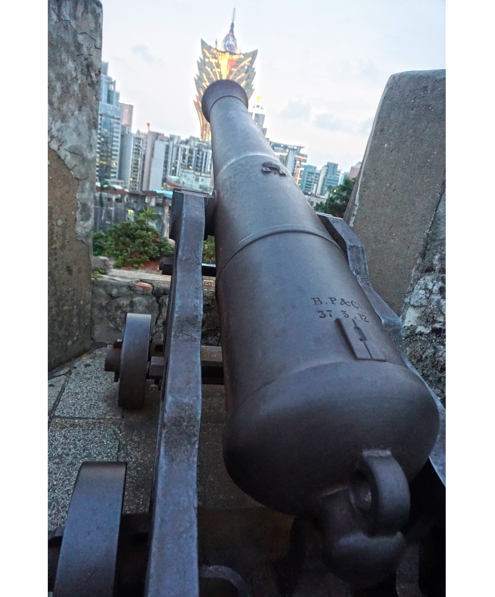 大炮台经历了300年的沧桑历史,终于在1966年解禁,成为向公众开放的旅游景区。现今,大炮台的中央便是1998年建成的澳门博物馆,而大炮台城堡的顶层则为大炮台花园,可以俯瞰澳门360度的风景。在大炮台上就可以看到新葡京娱乐场!此时天已经黑下来了。