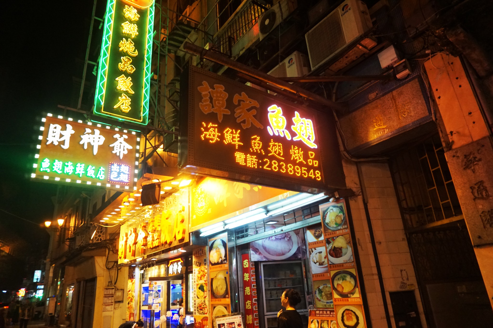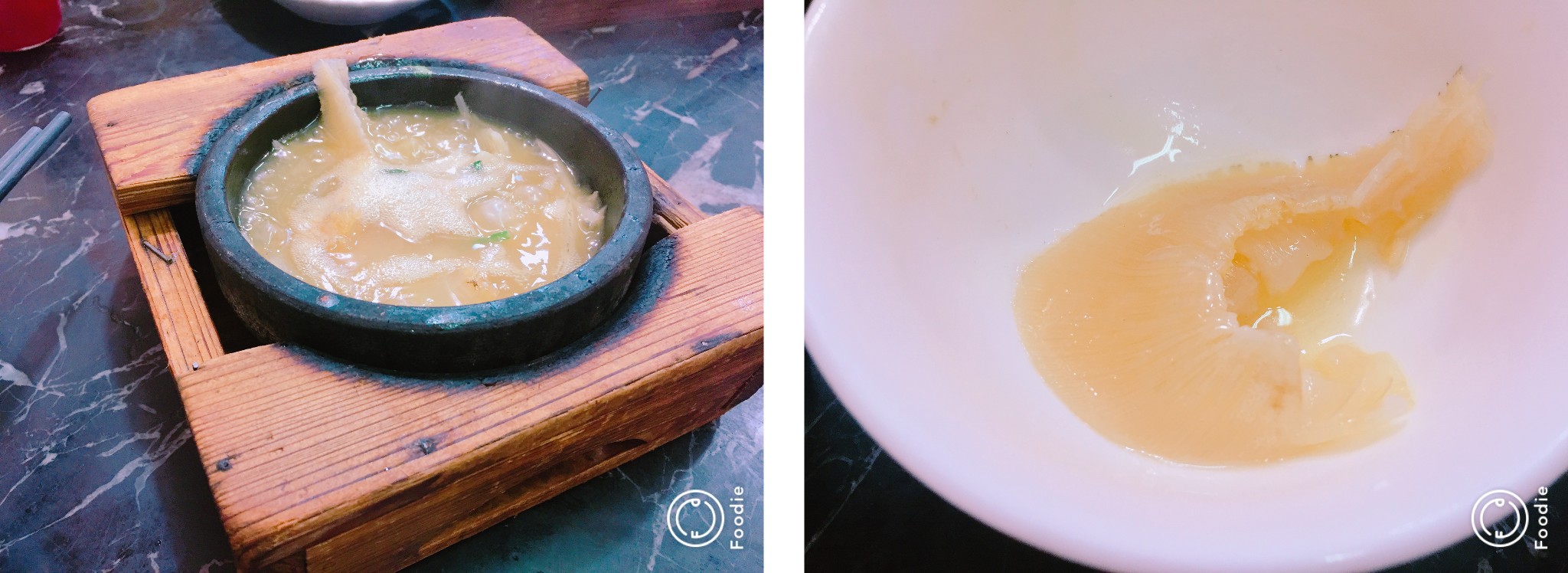 山下面便是有名的手信街,准备吃完饭再逛,可以买一些手信带回去,首先我们打卡谭家鱼翅。我们点了一份蹄根中鲍翅65,红莲炖雪蛤28,收茶位费6/位。鲍翅价格算是比较亲民的,红莲炖雪蛤就不怎么样了,是冰的一小碗,鲍翅算是小份。旁边的顾客一般都是点一份鲍翅,一份青菜,看来是标配