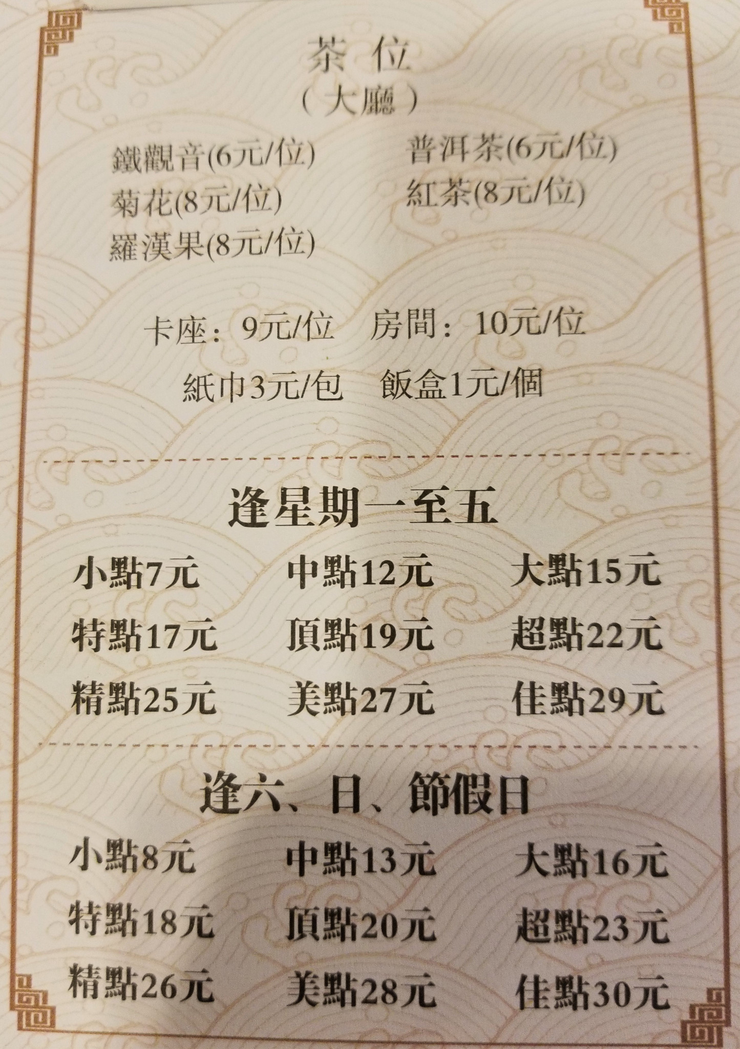 每个菜品后面是标记着小點、中點、大點等字样,而不是价位,在菜单的最下面有一个这样的价位表: