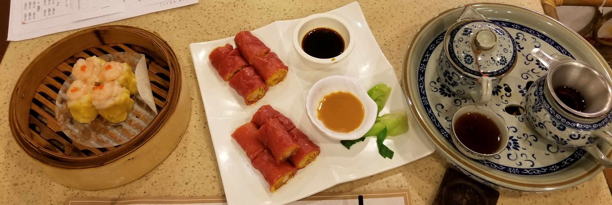 按照大家推荐的一人分量,一盅两件,我选择了普洱茶、金沙鲜虾红米肠和明虾蟹子烧麦。