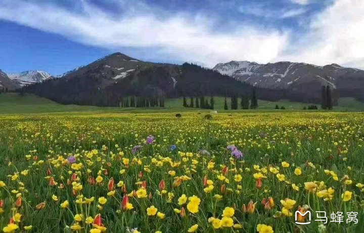 新疆昭苏油菜花开时,山坡上山花烂漫、五颜六色,花丛中蜂舞蝶狂。“金色瀑布”的油菜花海和天山雪山遥相辉映,犹如童话意境般,令人叹为观止,引起无数游客迷醉其间