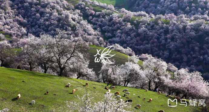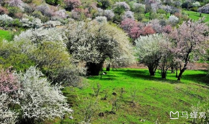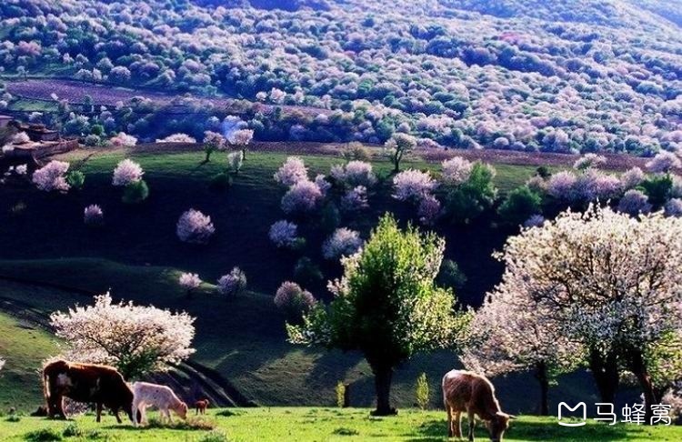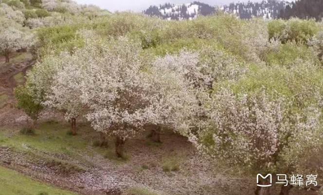 新源县阿勒玛勒乡,野苹果花海,4月中至5月初,五一期间的天山,山区还是冰雪消融的季节。天山野生苹果花,是紧随杏花之后的又一朵报春花,她不是果园里那娇艳的一朵,而是漫山遍野的怒放和狂野,让沉寂了一个冬天的大山焕发生机,开始了盛会之前的装扮。