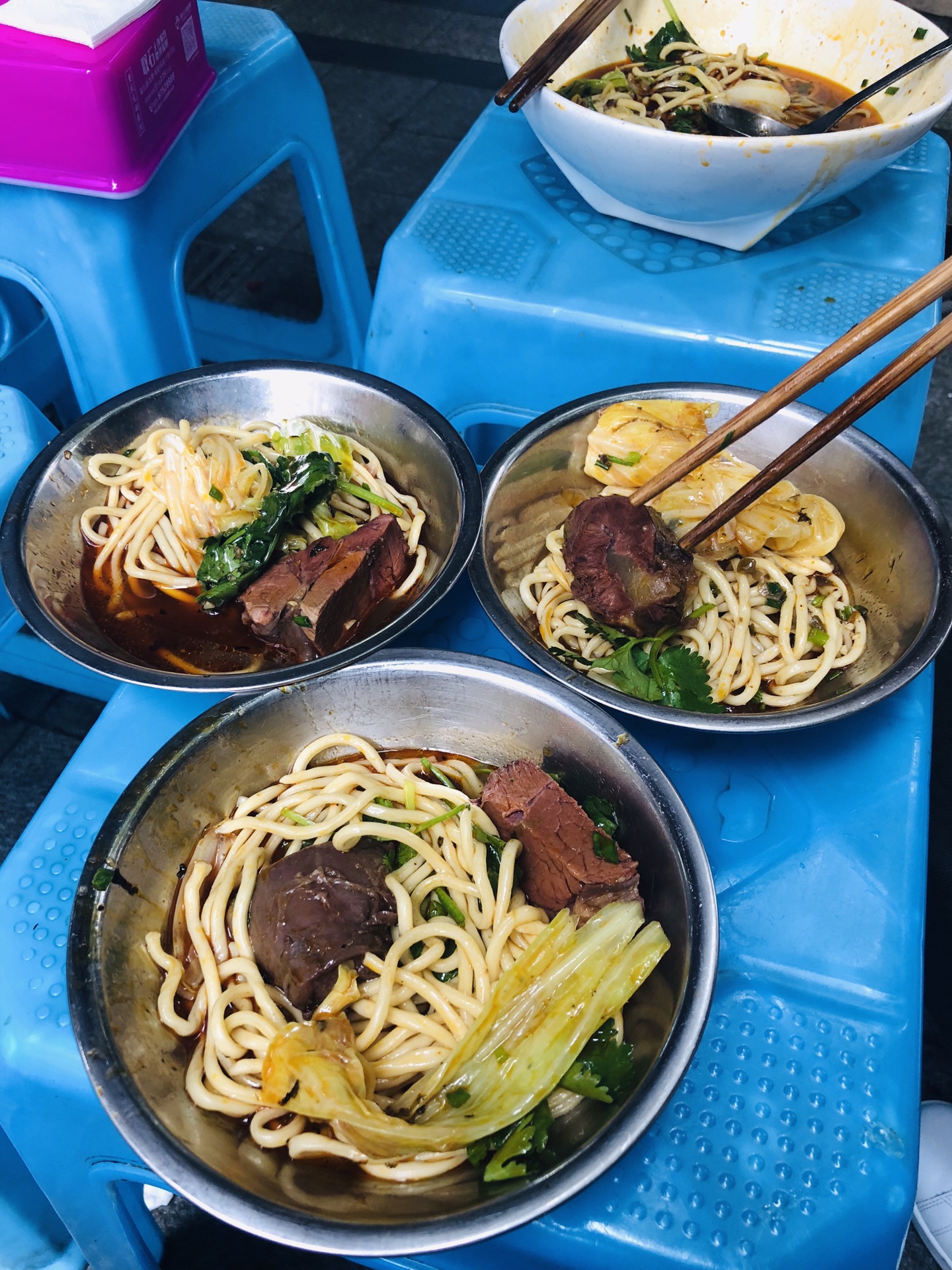 斗碗面50米对面街,三百碗,牛肉面,每天只卖三百碗,所以要上午来!刚吃过小面的我们觉得也是好吃到不行,牛肉也霸道,但是带牛肉的,确实价格小贵,如图所示牛肉量不是盖的……我们三个人只要了一碗,分开吃还是很饱。店面虽然不富丽堂皇,但是味道没得挑!