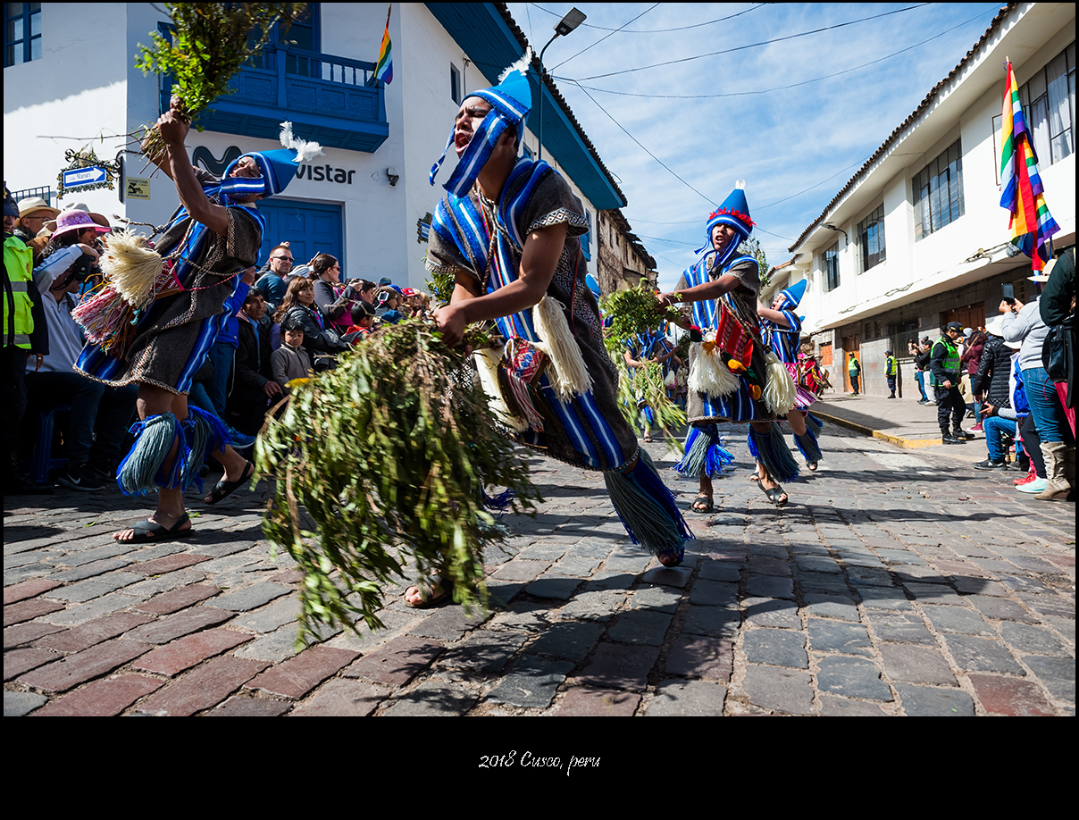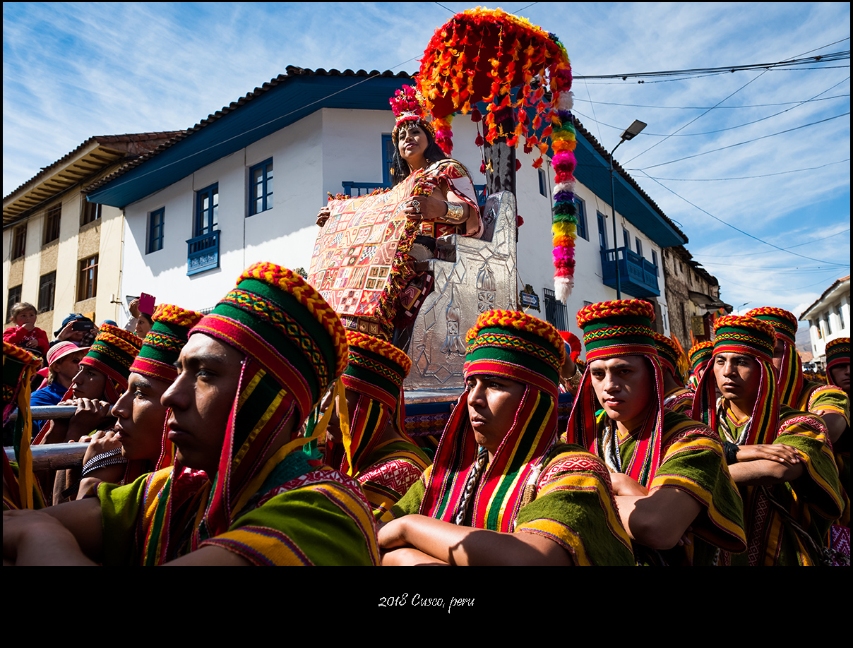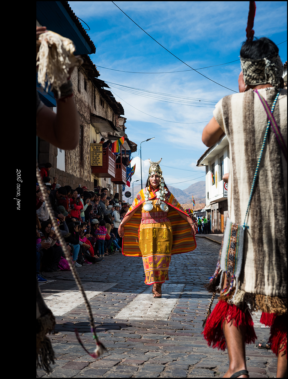 太阳神殿的开幕演出以印加王带领民众朝着太阳叩拜收尾,接下来庞大的游行队伍会穿街走巷前往古城中央的武器广场,那是第二处主会场。相比起会场中的表演来说,我更喜欢这种毫无拘束的欢庆游行。观众尽管被要求在路边与游行队伍隔离,但毕竟看来触手可及,少了看台上那种遥遥望去的隔阂,你会觉得五百年前的库斯科应该就是这样从街头巷尾的每一个角落里迸发出喜庆与祥和,人们彼此之间的真诚祝福和对美好生活的共同愿景在极具仪式感的歌舞中表现得淋漓尽致。