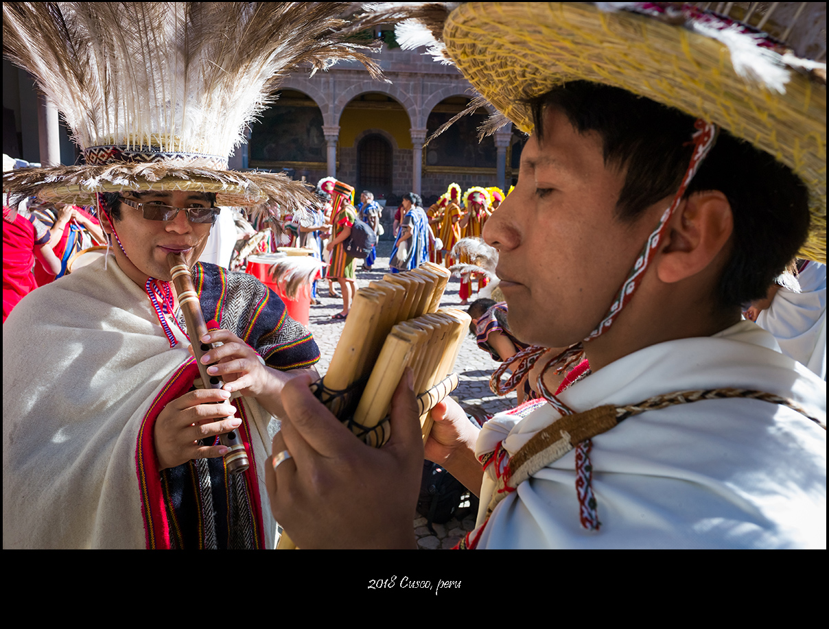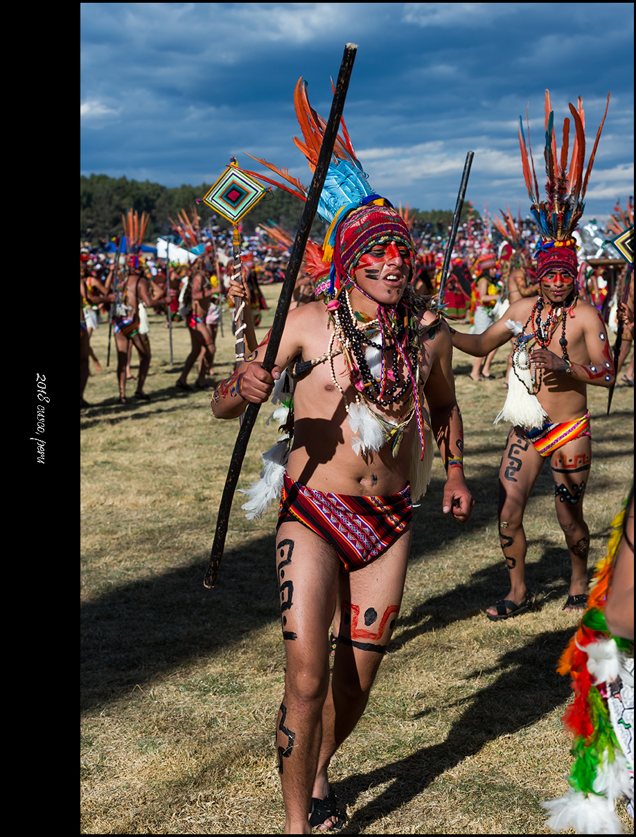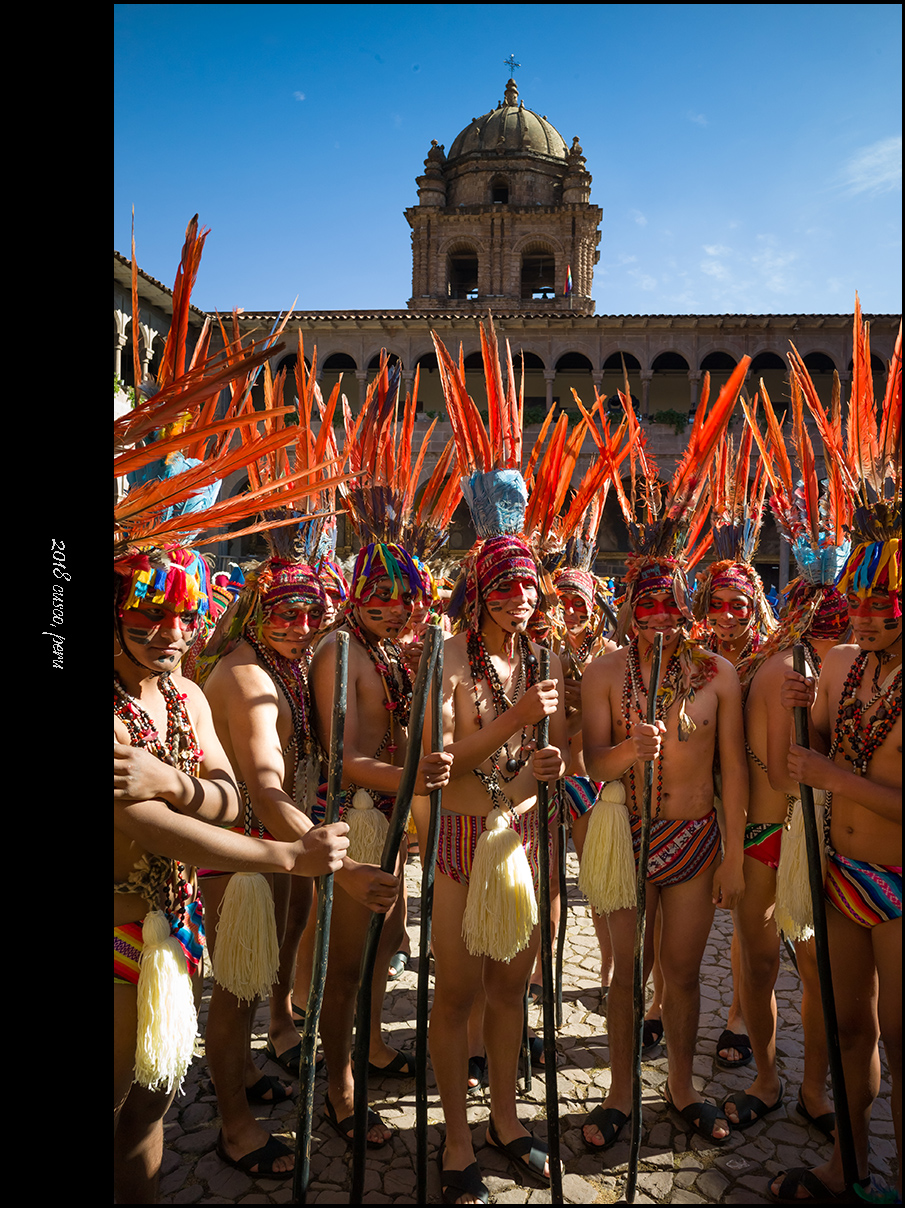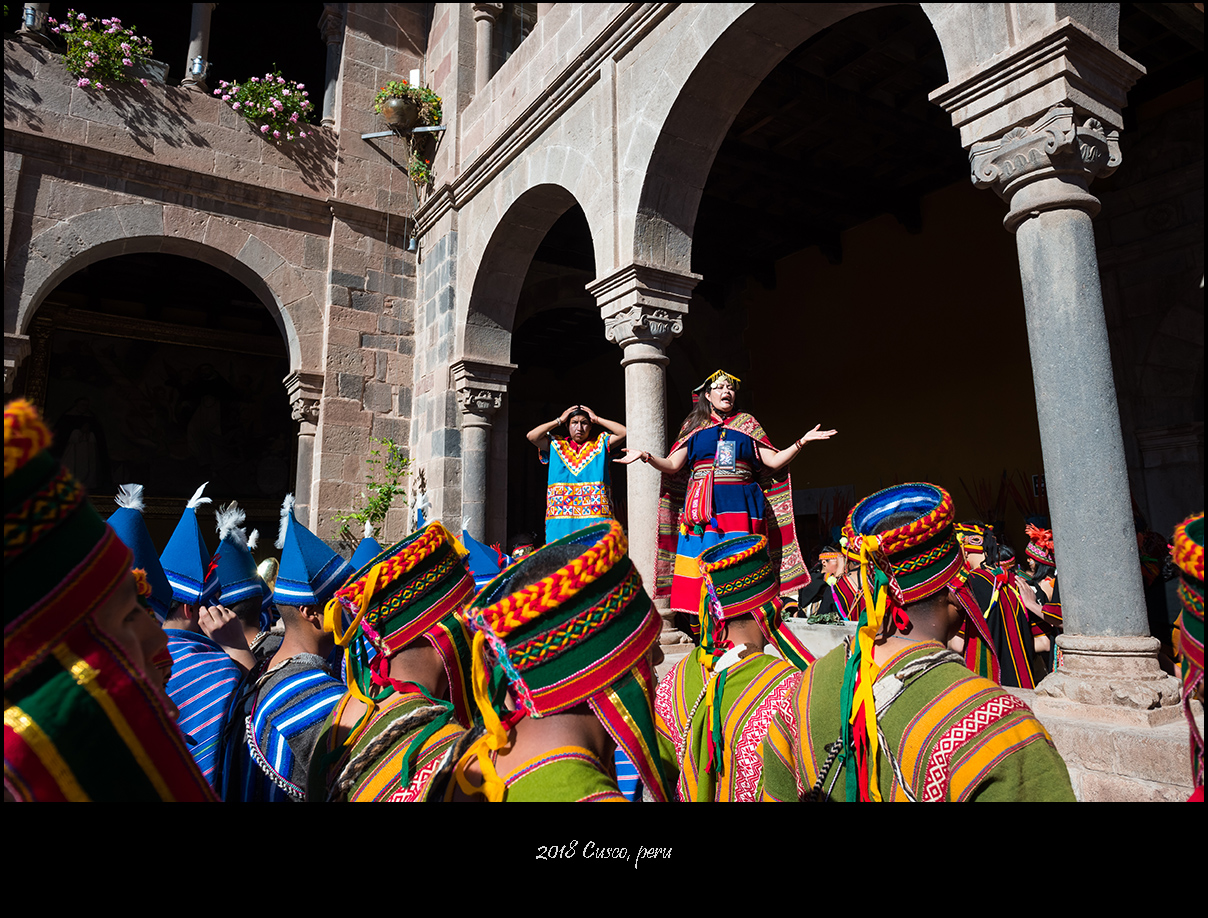 太阳神殿的开幕演出以印加王带领民众朝着太阳叩拜收尾,接下来庞大的游行队伍会穿街走巷前往古城中央的武器广场,那是第二处主会场。相比起会场中的表演来说,我更喜欢这种毫无拘束的欢庆游行。观众尽管被要求在路边与游行队伍隔离,但毕竟看来触手可及,少了看台上那种遥遥望去的隔阂,你会觉得五百年前的库斯科应该就是这样从街头巷尾的每一个角落里迸发出喜庆与祥和,人们彼此之间的真诚祝福和对美好生活的共同愿景在极具仪式感的歌舞中表现得淋漓尽致。