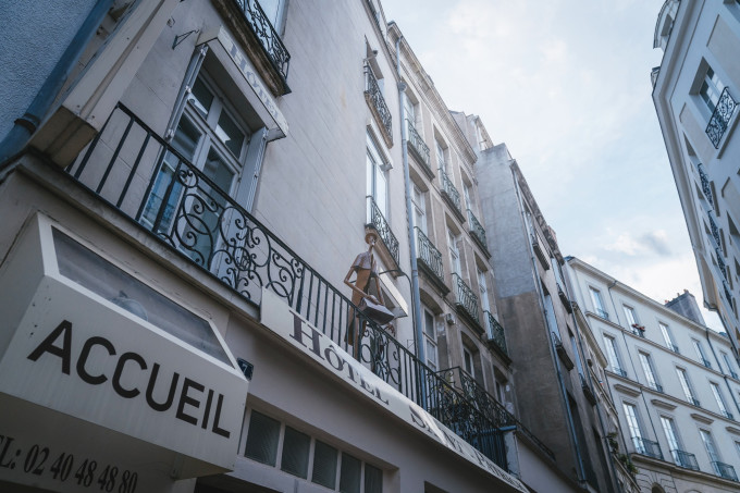 ▼一个铜人,提着旅行包,成了酒店的招牌,在南特,每一件艺术品都有自己的使命和价值。