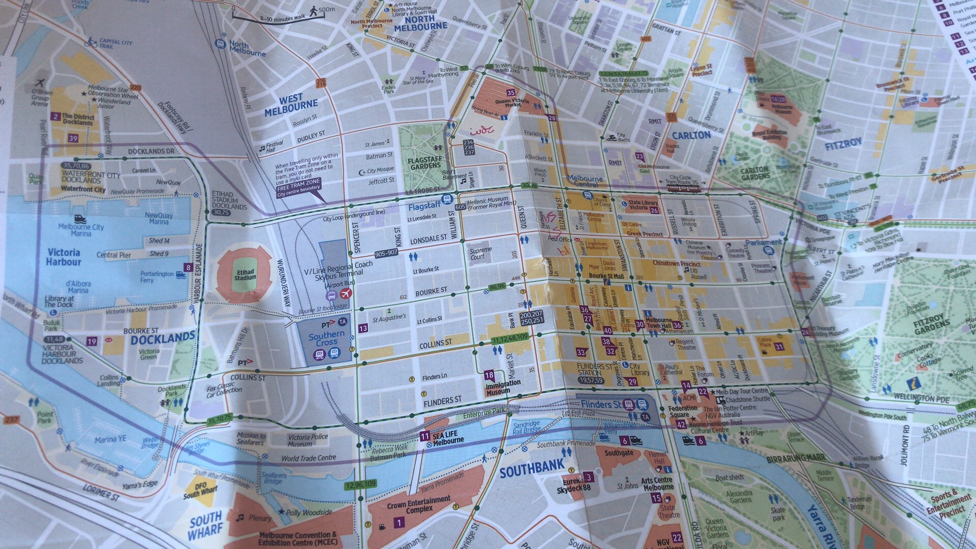 这里的政府福利好好,只要你不走出CBD,无论你是澳洲人还是境外人,电车一律免费乘坐,卡都不用买。那这个界定范围怎么定很多攻略都有提过但具体是什么哪个线路并没有提,其实在游客中心可以拿一个地图,他们上面会有一个紫色的圈圈住一片区域,只要你坐车不坐到圈外的站点都是免费的哦。车站也会有绿色的标识写着free tram zone。只要蜂蜂们看好目的地,出门逛街就是0成本了。