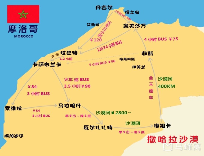 城际交通:我们出行除了丹吉尔-舍夫沙万是包车以外,其他的城际交通均为公共交通,舒适程度挺不错,准点程度也高,适合一两人出行的组合。所有的票均从旅行社购买,购买路径:马蜂窝——星际云(北京首航国际旅行社专营店),真的是一家超级靠谱、超级良心的店,买个票有一个十几个人的微信群服务你,随时随地解答你的任何问题。