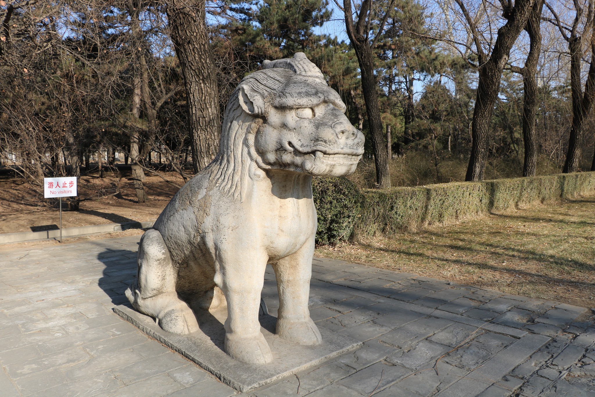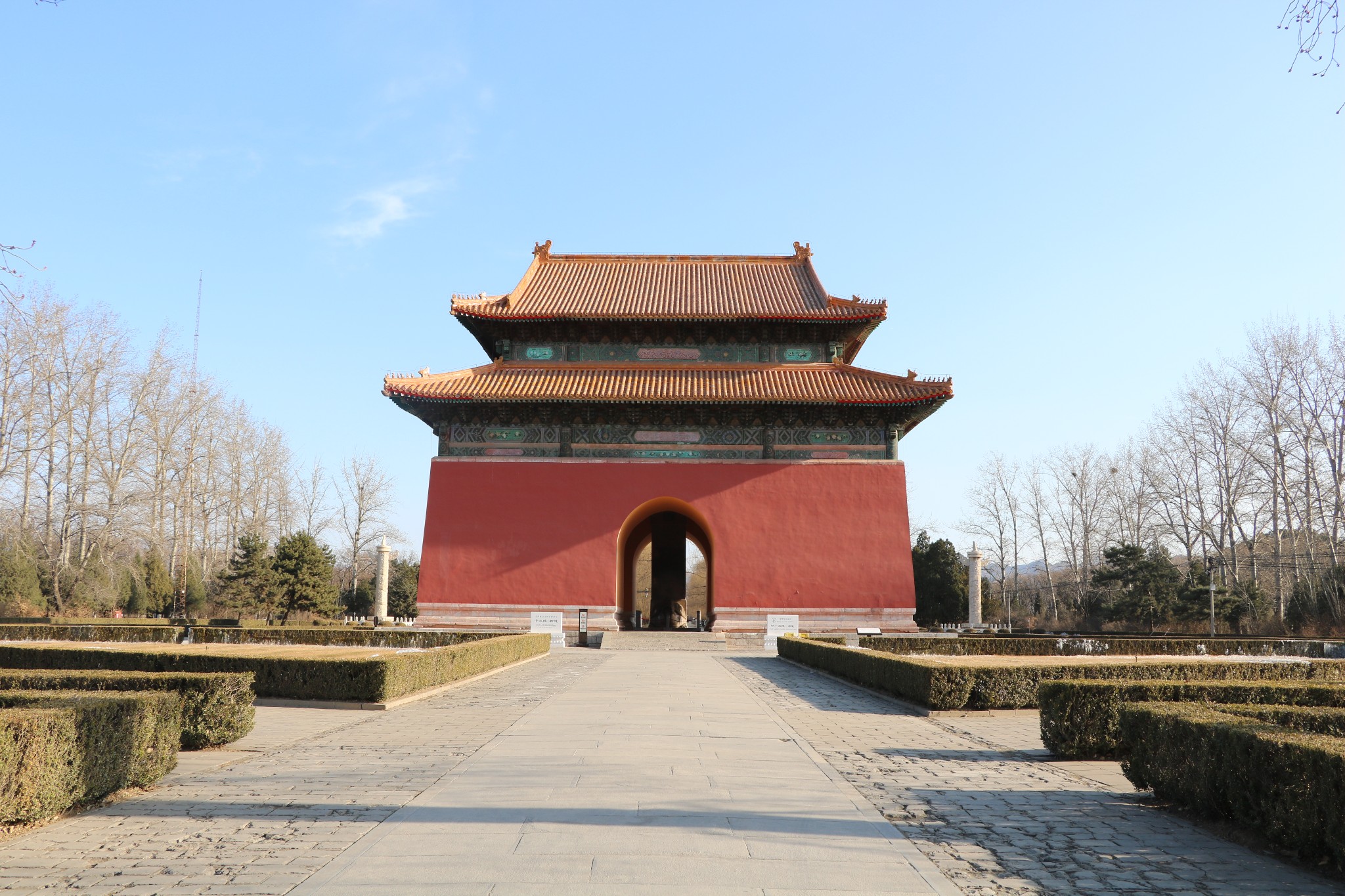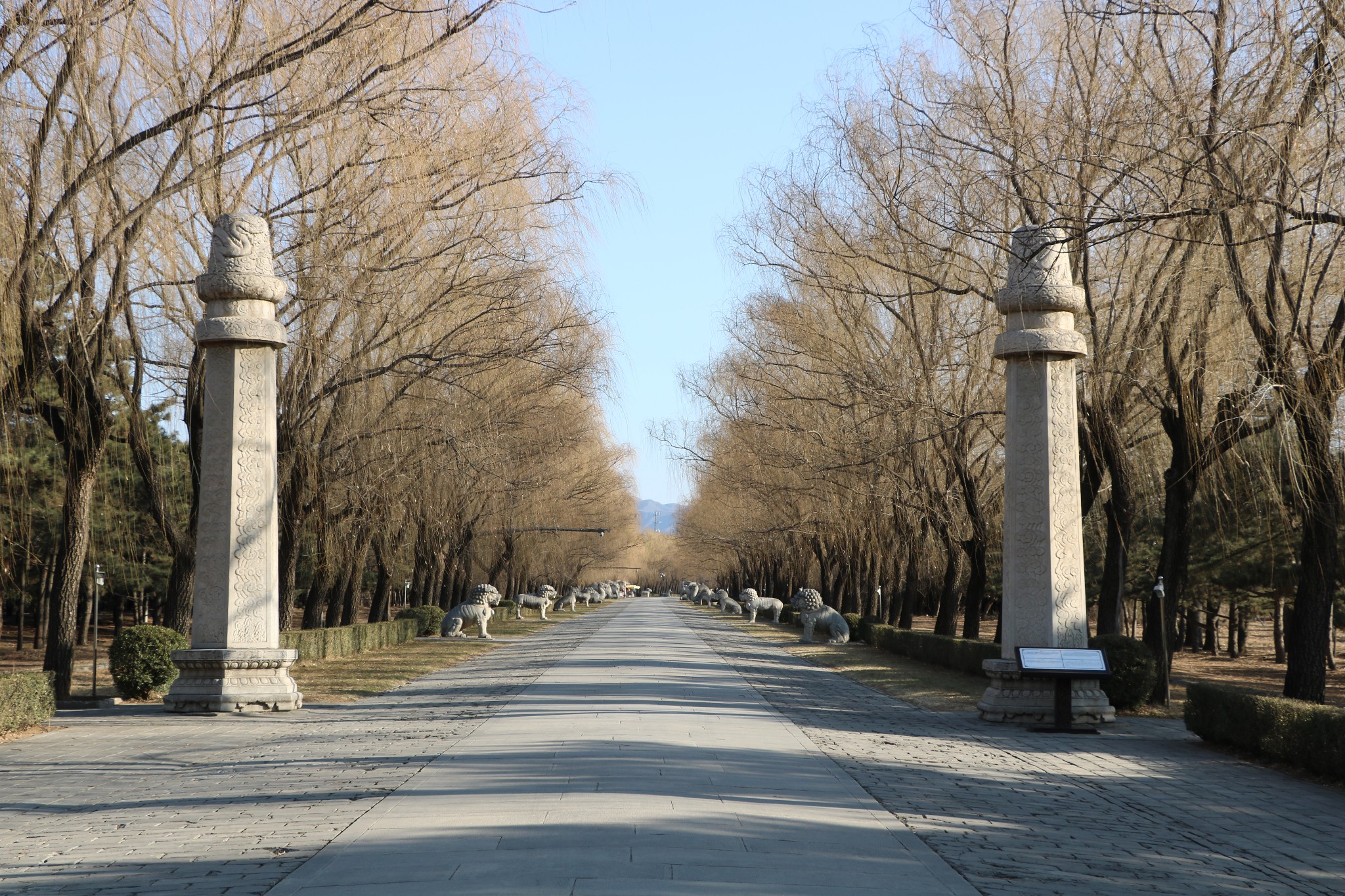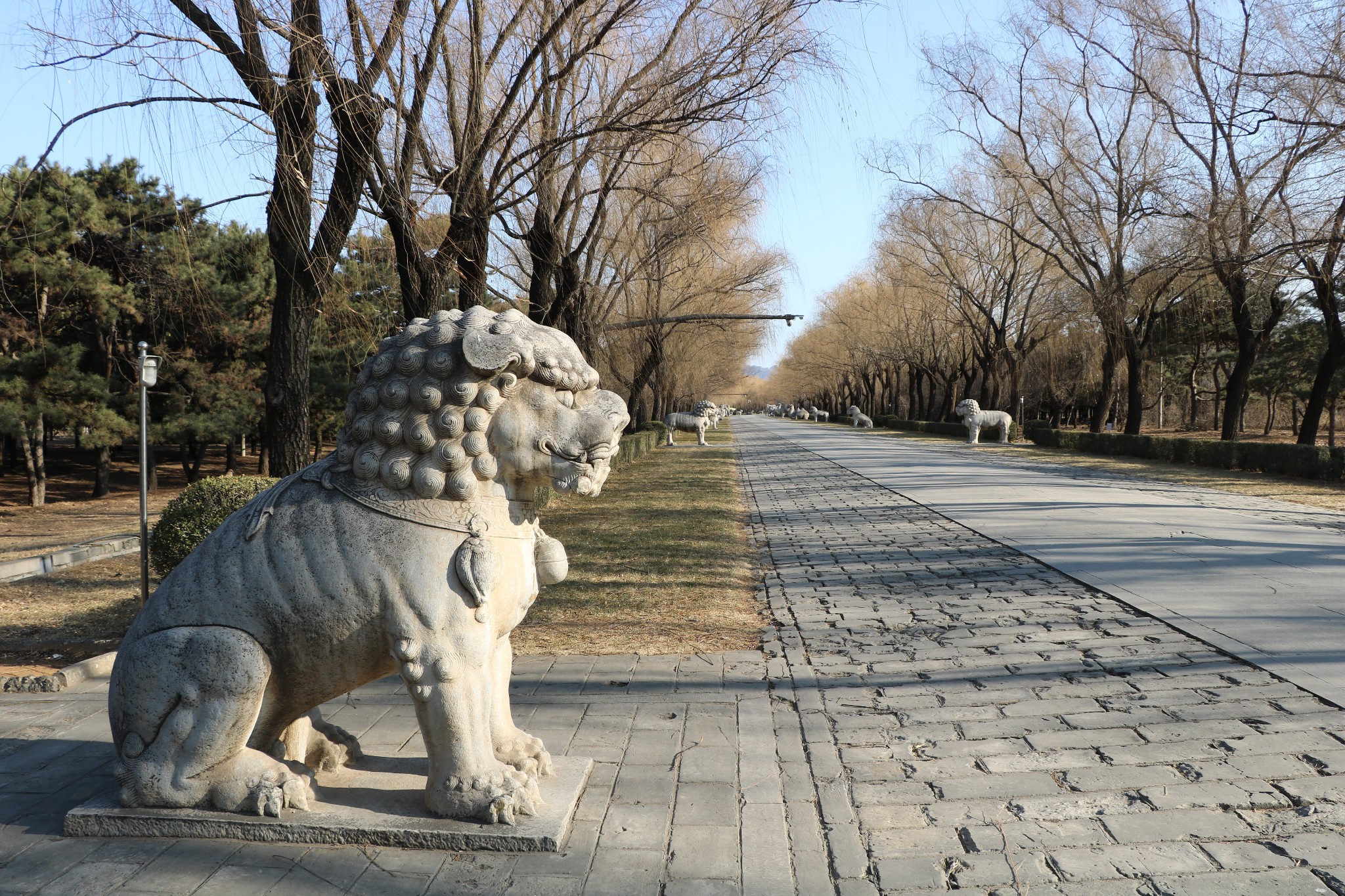 大红门(又名大宫门)后的这条大道,叫神道,也称陵道。它起于石牌坊,穿过大红门,一直通向长陵,原为长陵而筑,但后来便成了全陵区的主陵道了。该道纵贯陵园南北,全长7公里,沿线设有一系列建筑物,错落有致,蔚为壮观。
