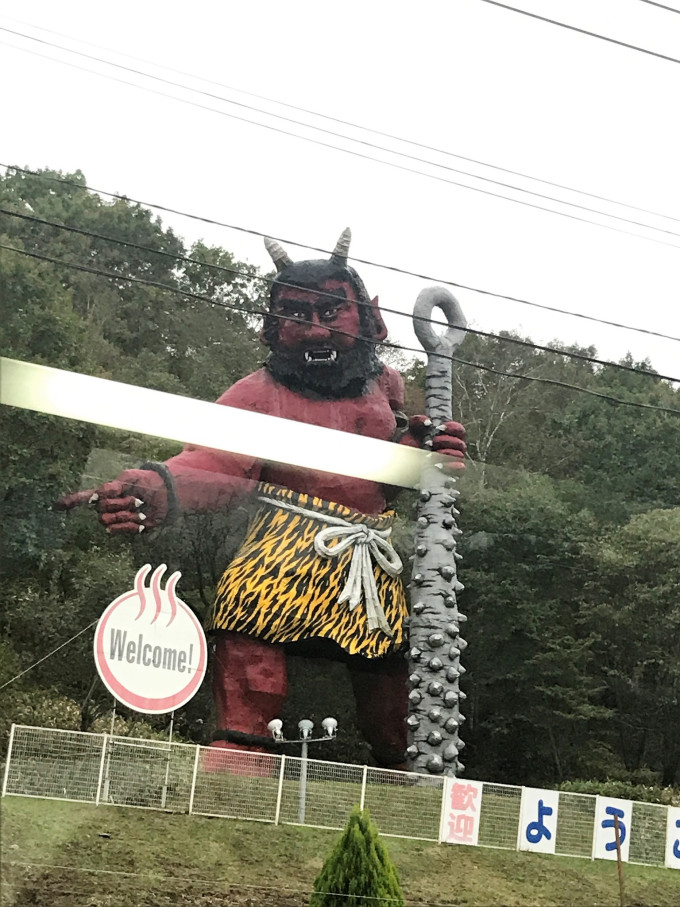 伴随淅淅沥沥的小雨,巴士大约30-40分钟到达登别地狱谷。门口的迎宾先生有奔放的喜感。