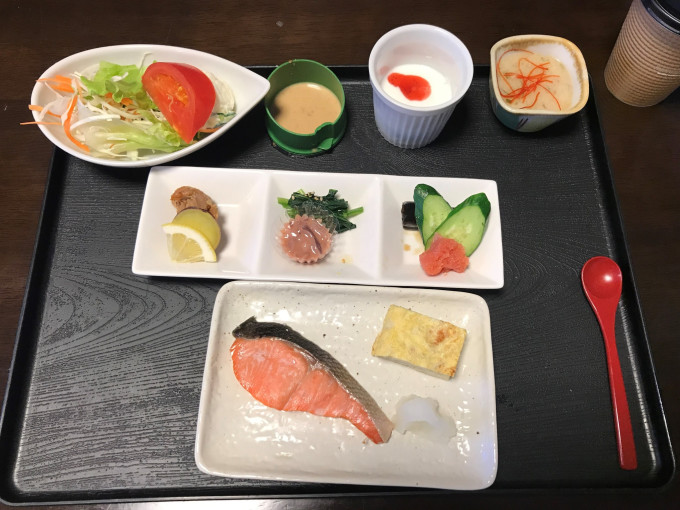 日式酒店不提供咖啡,先在711来了一杯提提神,味道很香。然后集体吃早餐啦,我的妈啊,以为回到了晚餐席: