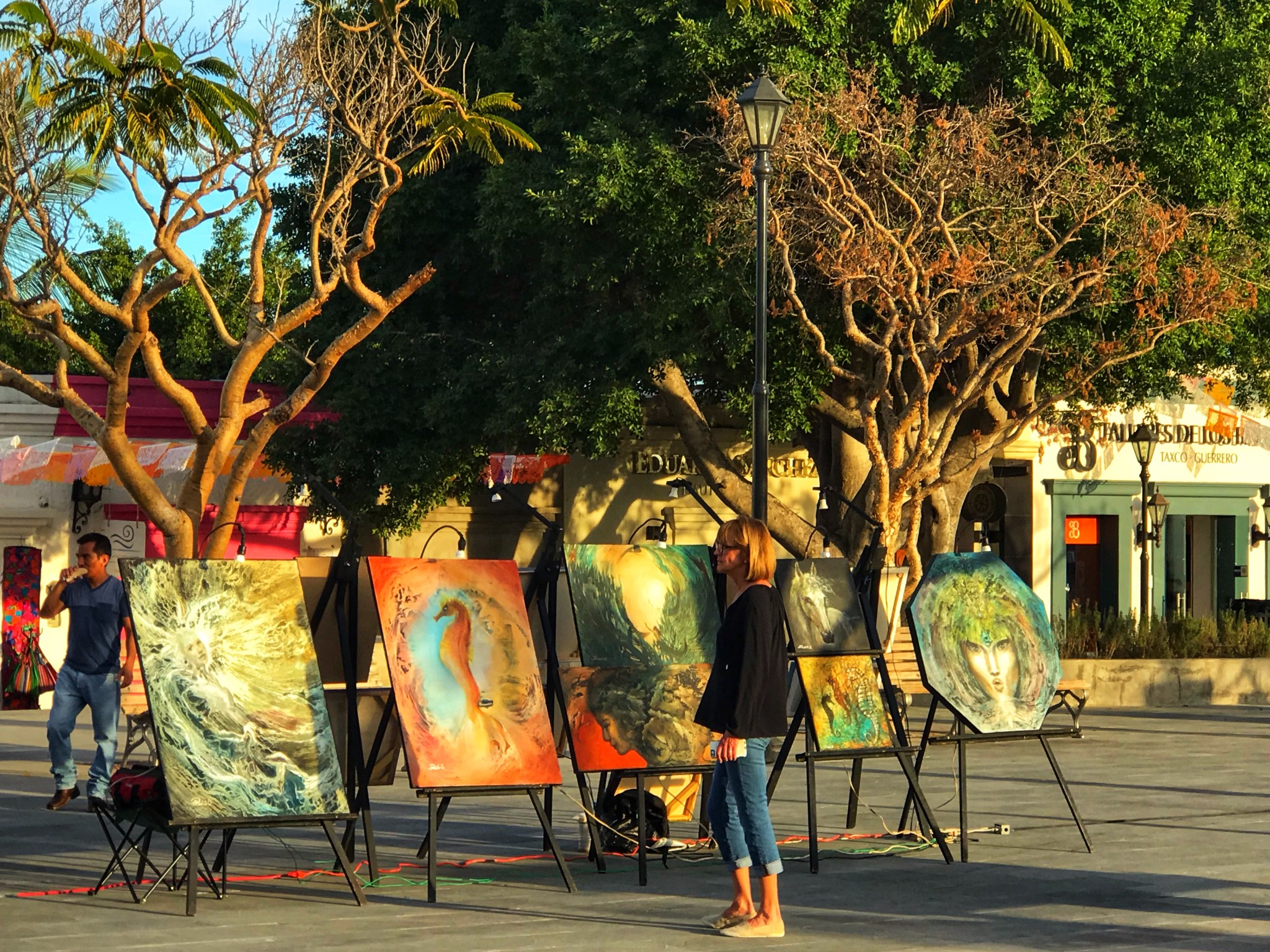 傍晚去我们住的老城San Jose 艺术区闲逛, 这里的气氛挺自由的,每星期四傍晚这里就变成步行区,有些艺术家就在街上或画廊里卖自己的画或作品。有很多酒吧和餐馆. 大部分艺术品是不让拍照的。白天人行稀落,傍晚5、6点后,熙熙攘攘的行人、商贩象是从地下突然钻出来一样。风闻墨西哥晚上酒吧不太安全,所以我们离开得比较早。而我们沙滩排球的球友,来自阿拉巴马的白人小CP则玩得很晚。而且come back in one piece. 所以危险感知度因人而异吧。