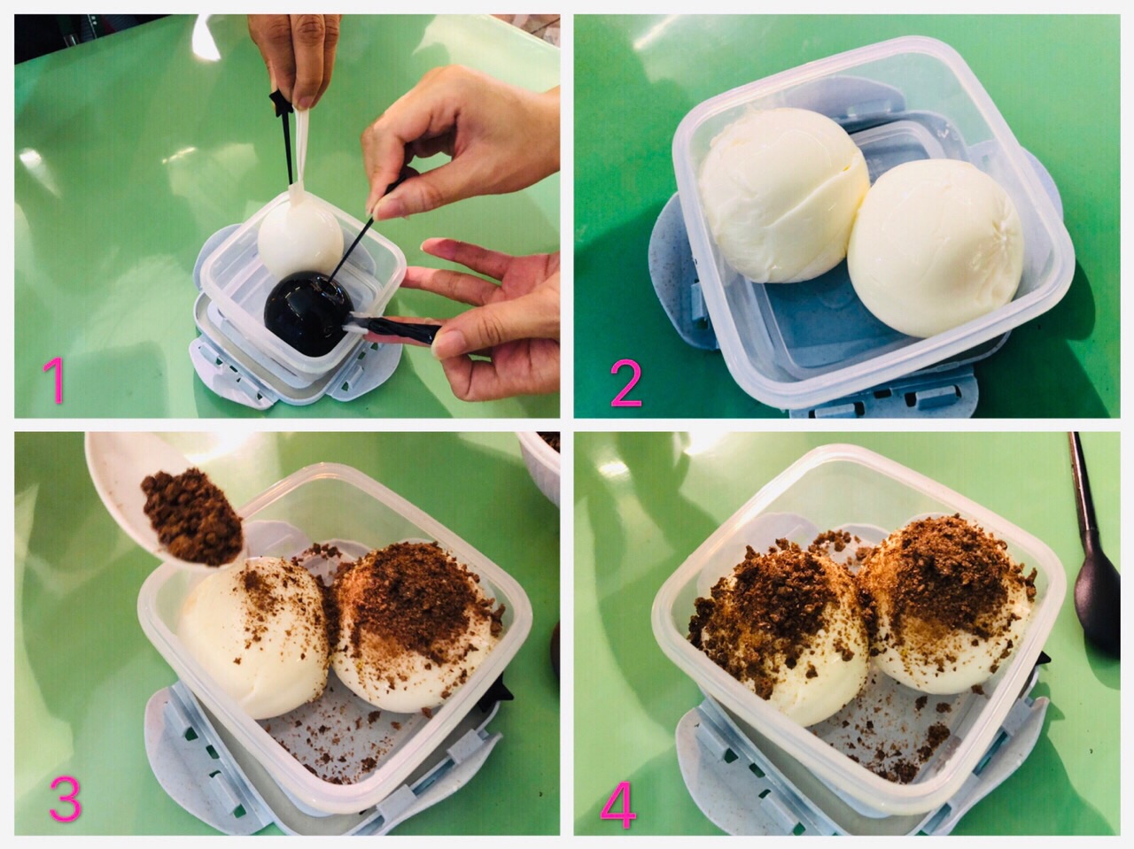 这两个外表看上去平平无奇的球体,装在汽球簿衣(煮食安全物料)里面,用牙签戳破后原来是用日本3.6牛乳做成的牛奶布丁,加上阿华田脆脆,吃法真的好新颖。